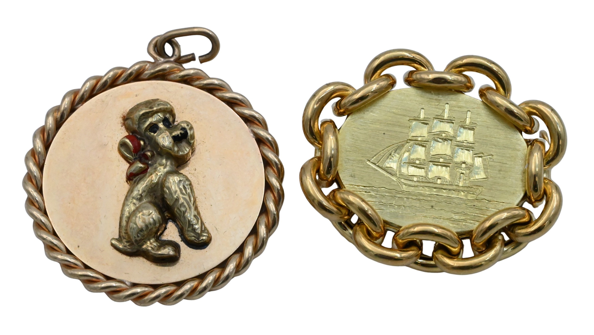 Including one circular pendant depicting a dog with a red bow, and one oval pendant depicting a ship under sail.