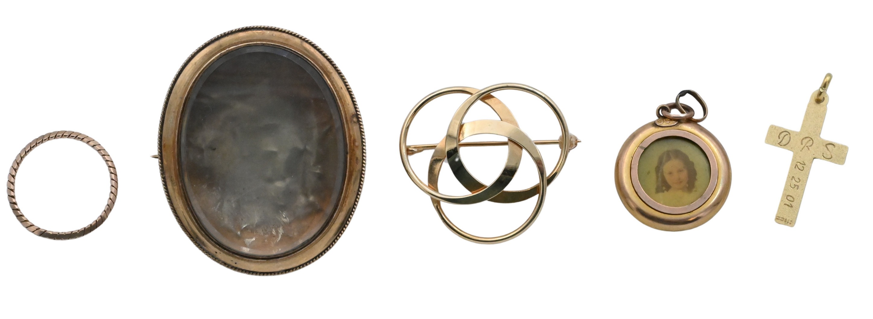 to include double sided picture pendant having nine photos, interlocking circle pin, cross pendant, a ring, and a Victorian brooch
