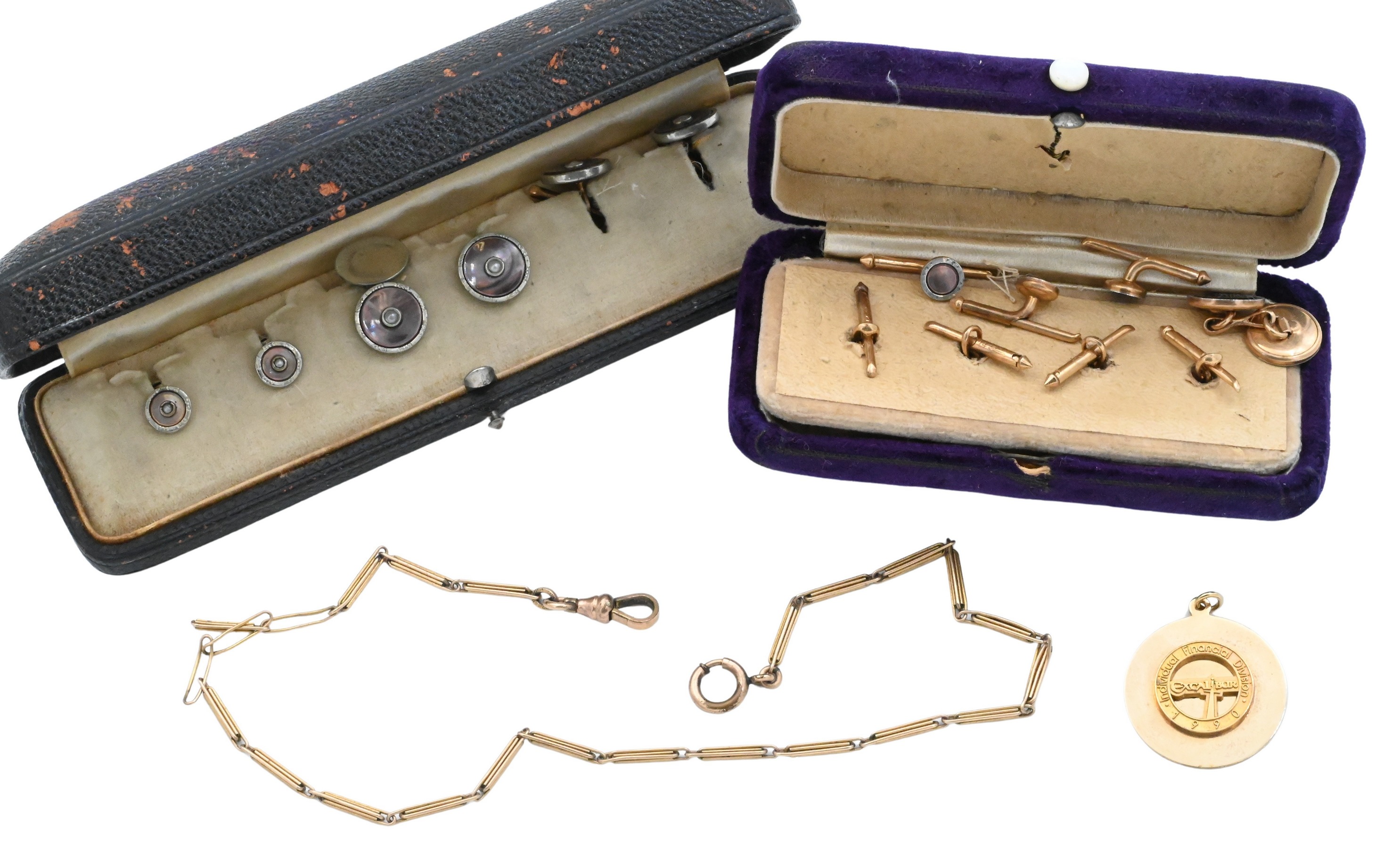 Including one 14K yellow gold and mother-of-pearl dress set comprised of a pair of cufflinks and four shirt studs, total weighable 15.0 grams; together with one silver and mother-of-pearl dress set housed in fitted cases marked Benedict, Atkins & Co. and Lederer & Krasny, New York., along with a pocket watch chain, and gold filled pendant.