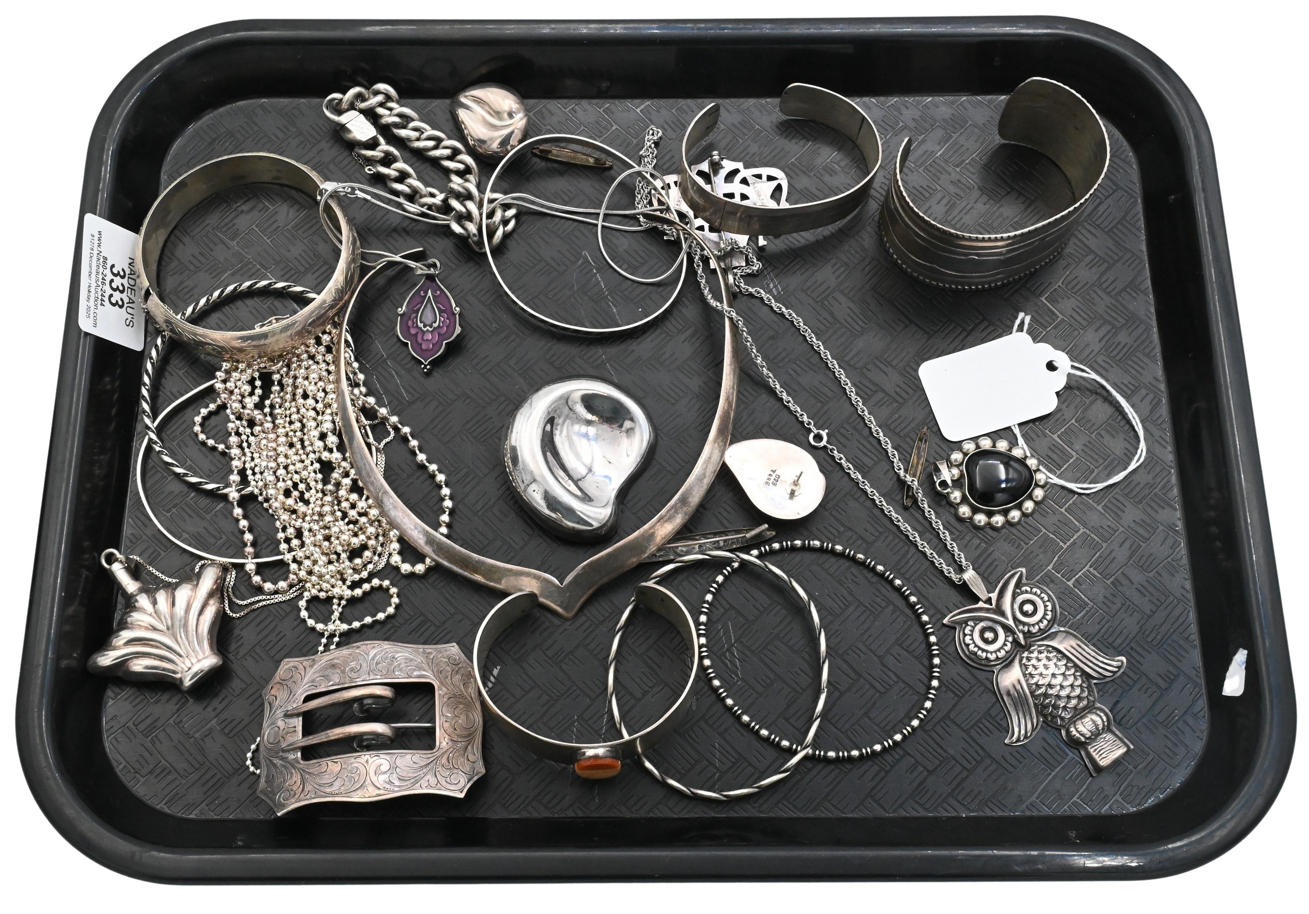 Including examples marked Sigi Taxco, Mariana, Carolee, Brighton, and Sterling Wega, Cuba, together with various silver-plated, gilt, resin, and beaded pieces. Designs include modernist sterling link bracelets, faceted bead stretch bracelets, and woven mesh chains.