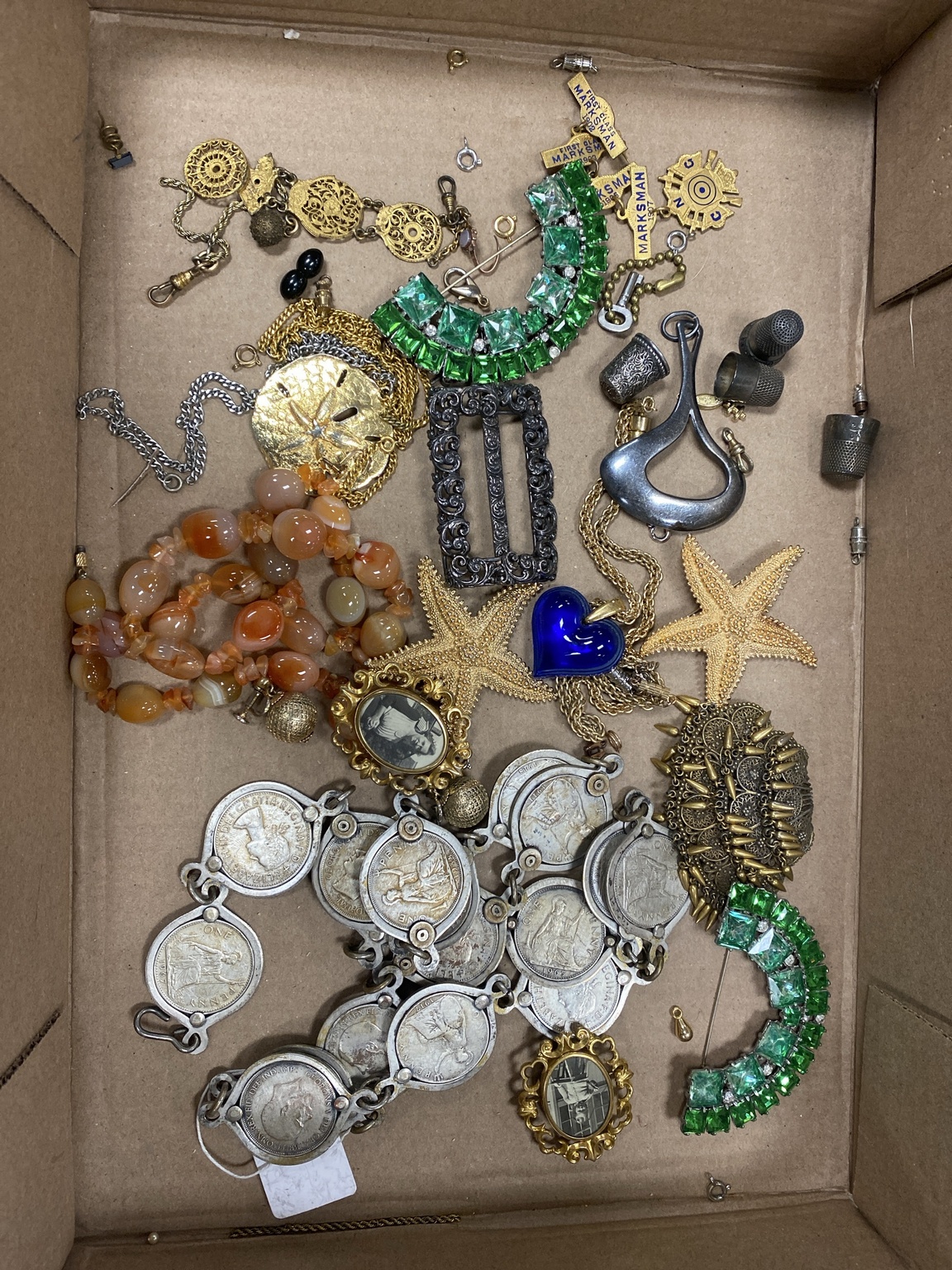 Including two Monet gilt metal starfish brooches, one Monet chain necklace, one Erik Dennung modernist pendant, and assorted vintage and costume jewelry items featuring beaded bracelets, coin jewelry, and set stones.