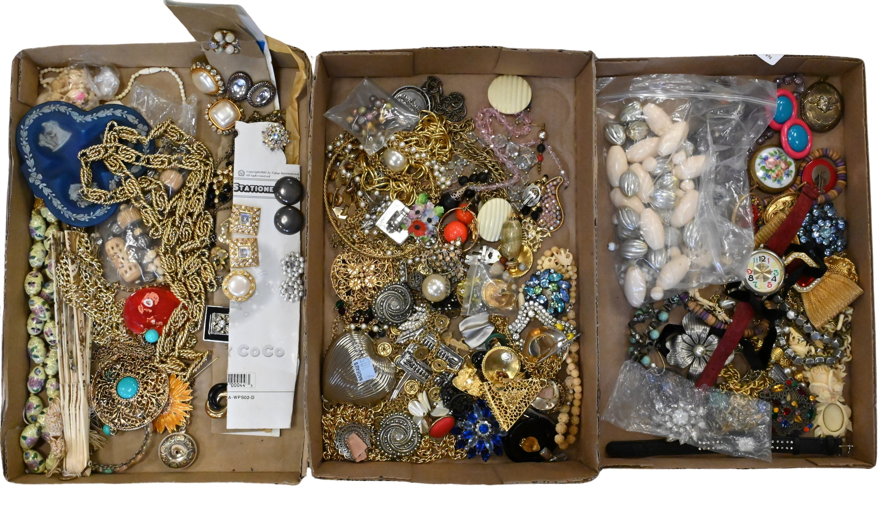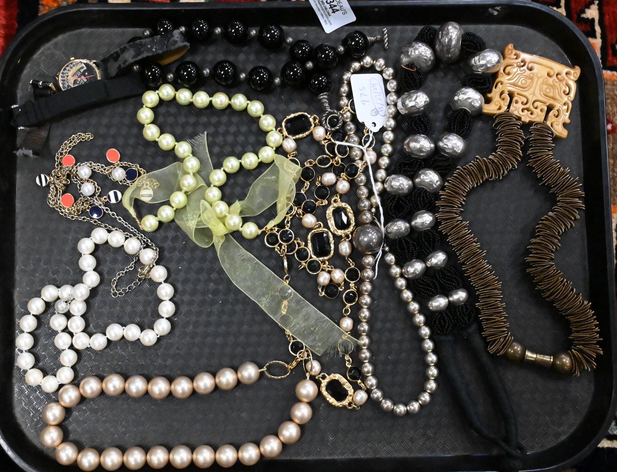 A large and varied assortment including necklaces, chains, clip earrings, bracelets, brooches, and pins in assorted gilt, enamel, beaded, and faux pearl designs. Makers include Bijou Turner, Limoges France, and others, together with a stainless steel wristwatch, miniature mirror compact, and assorted rhinestone, cameo, and resin-set pieces.
