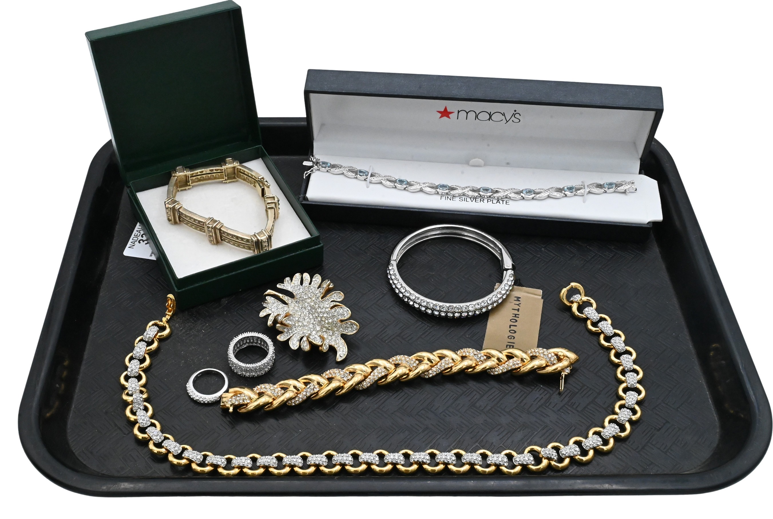 Including examples marked Les Bernard, Mythologie, PAJ China, and Sterling, comprising necklaces, bracelets, and rings with cubic zirconia, crystal, and pave-set designs; one two-tone link necklace and a textured bracelet with diamond-cut pattern.