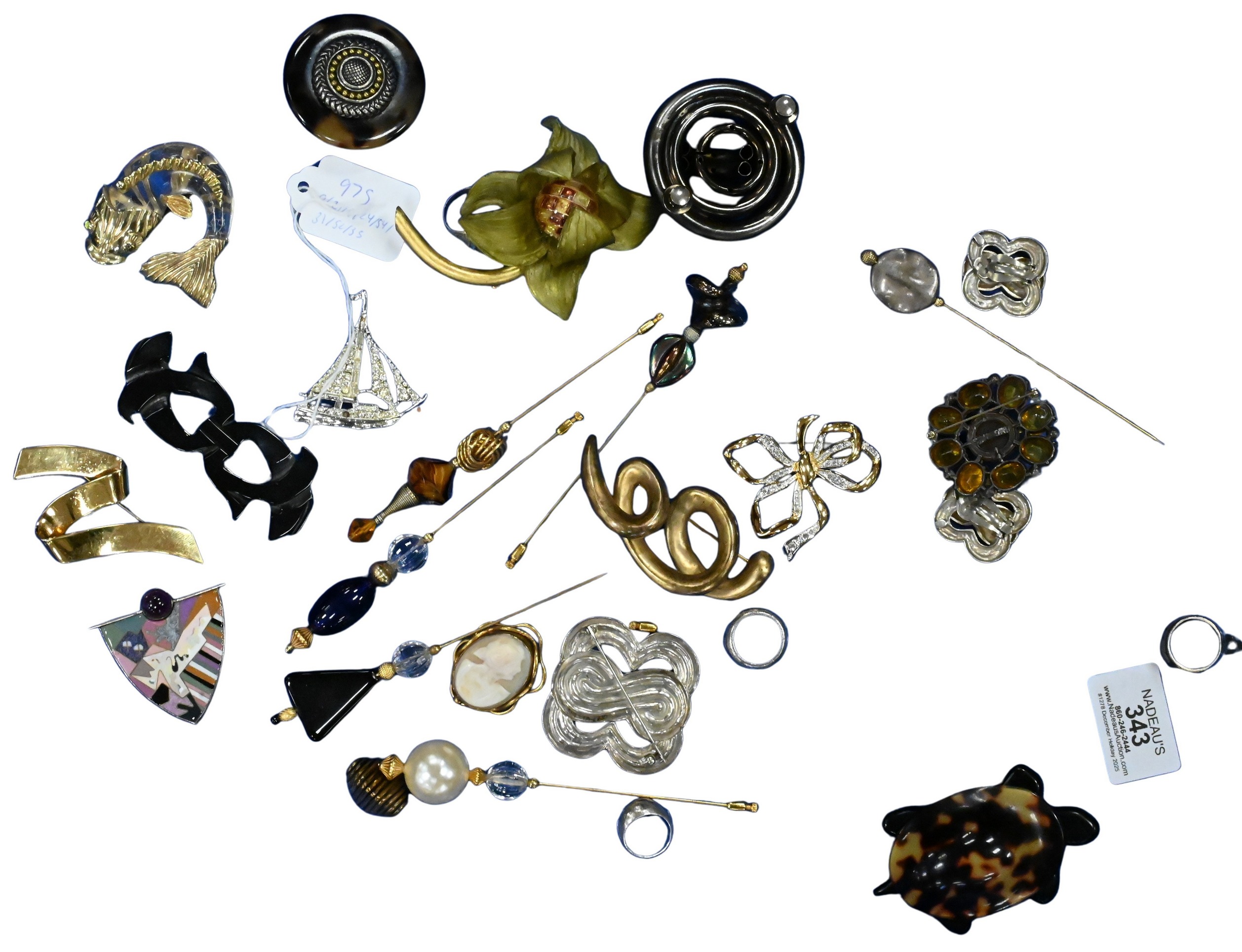 Including examples marked Les Bernard, Les Stein turtle brooch, Monet, H. Sterling, and a Swarovski crystal ring, together with other mixed-metal and costume pieces featuring enamel, lucite, and hardstone elements. Varied modernist, figural, and geometric designs.