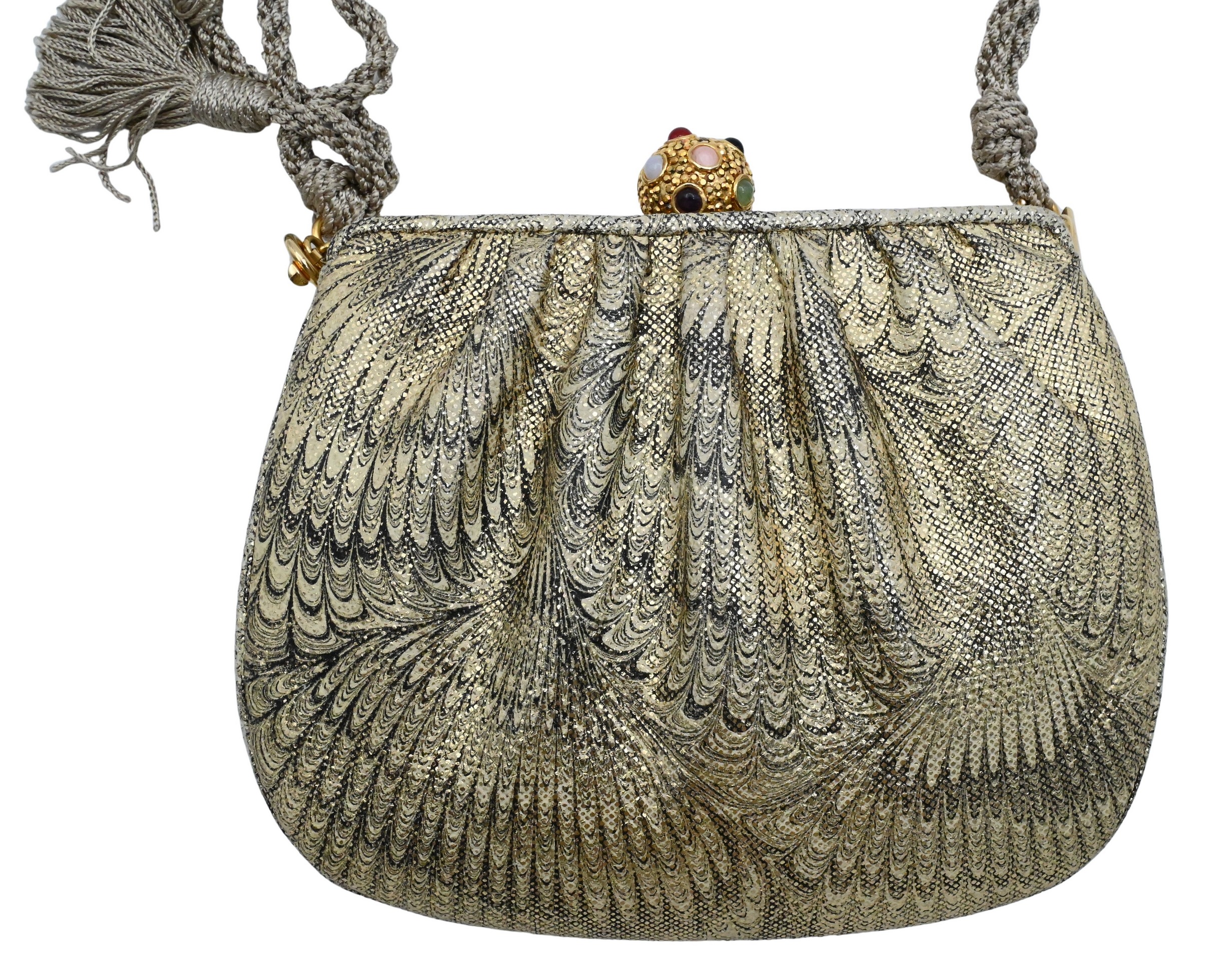 Gilt and metallic fabric minaudière with swirling feather-patterned brocade design, the clasp in the form of a domed sphere set with multicolored cabochon stones, interior lined in blush satin with gilt plaque signed Judith Leiber®. Together with two Judith Leiber gilt metal compacts and one silver-tone compact, each signed, one inset with carnelian-colored cabochon and one with jade-green cabochon.
