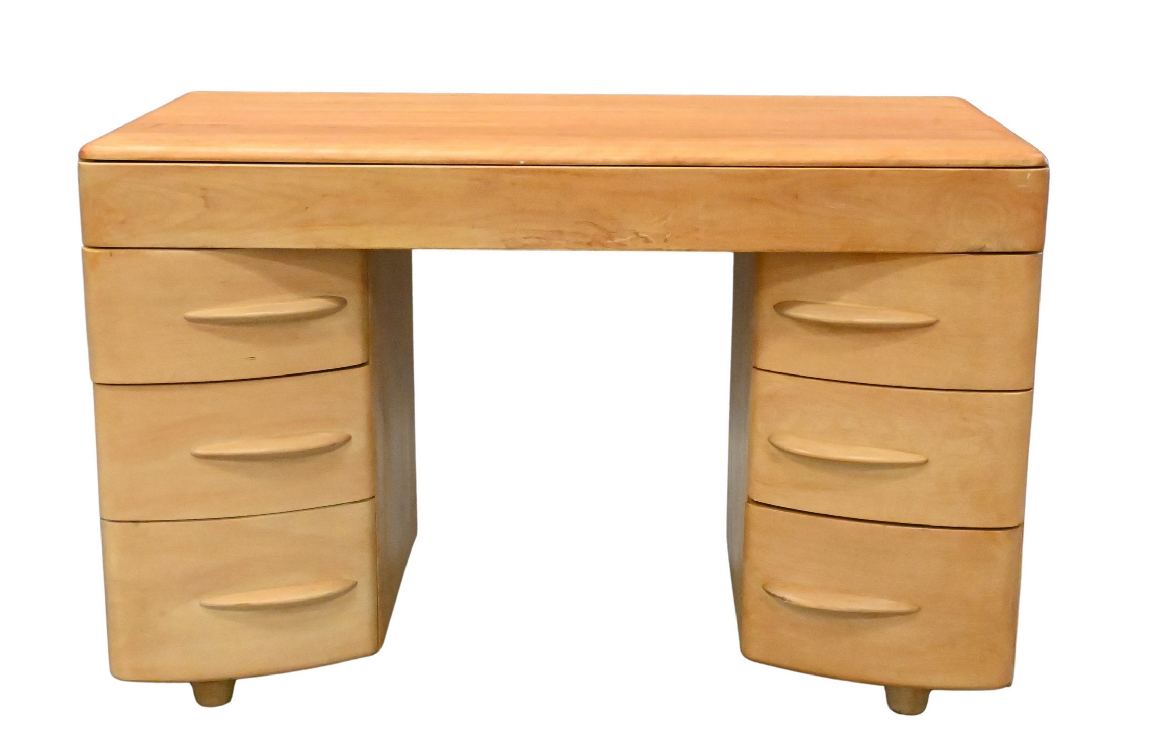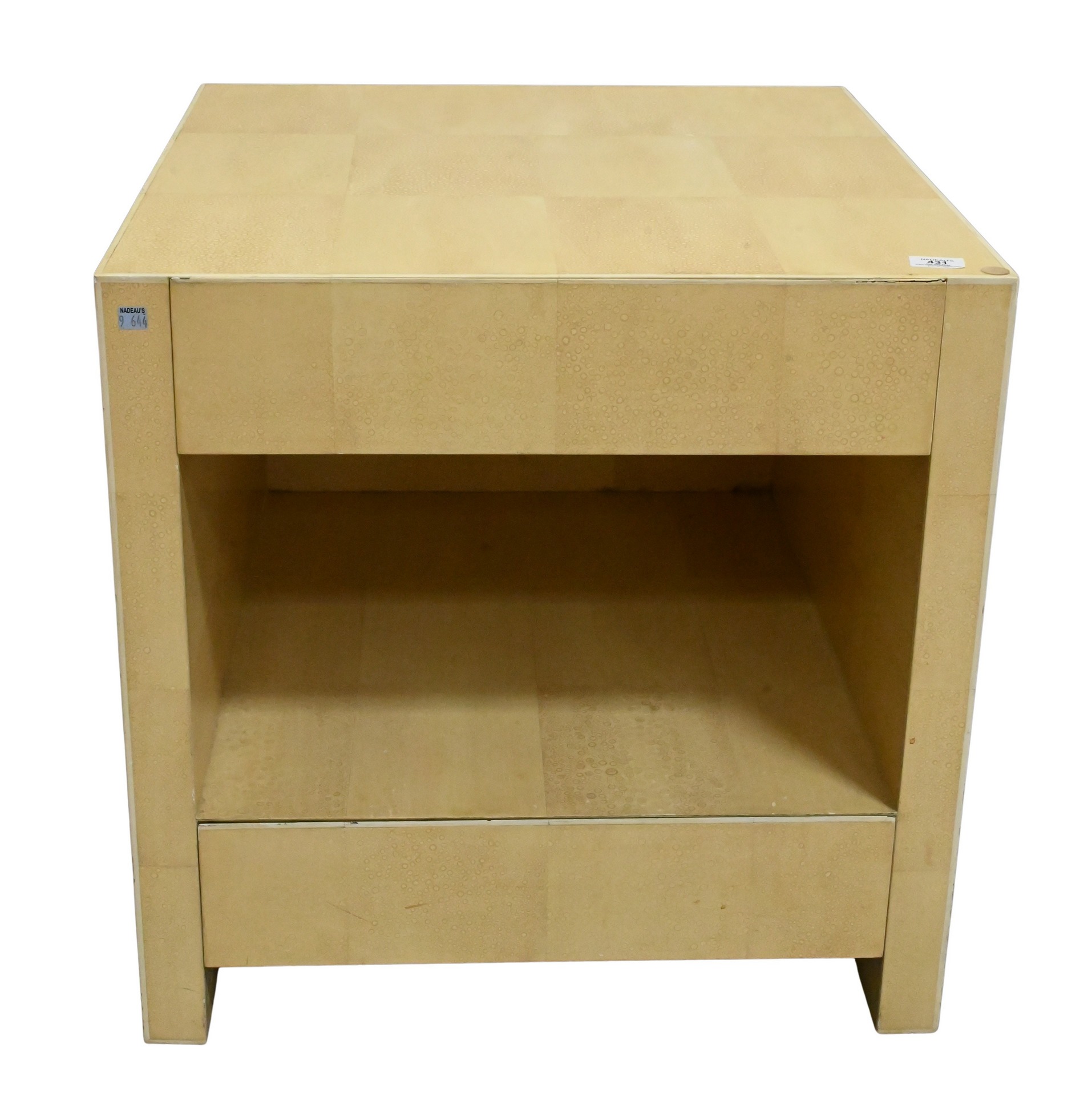 cream colored mid-century modern table having single flush drawer over additional storage space