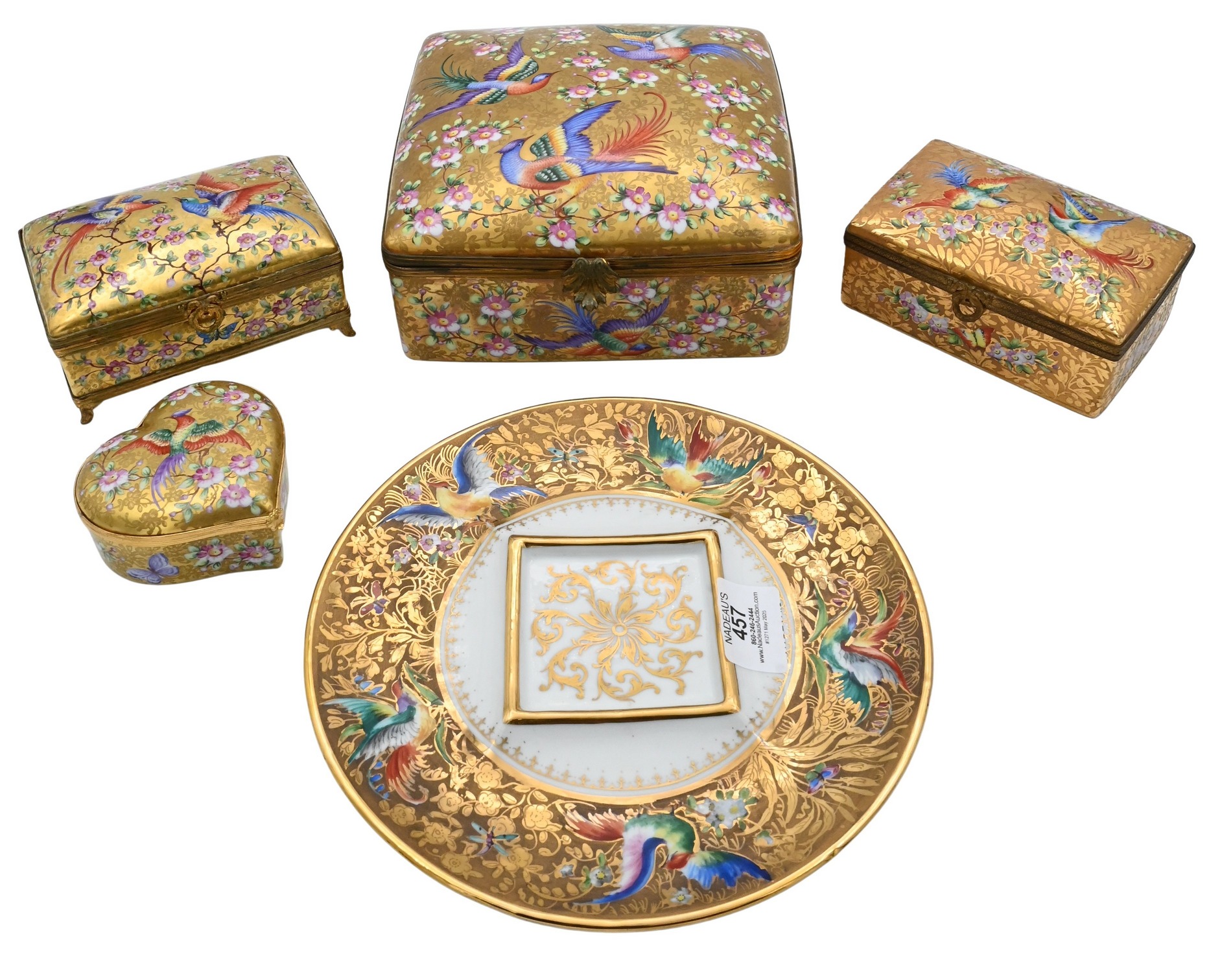 to include one heart form trinket box, one rectangular box, one rectangular box raised on gilt feet, on oyster plate each having gilt and hand painted polychrome bird and butterfly motif marked on underside, one large hinged jewelry box with Marechal Paris label