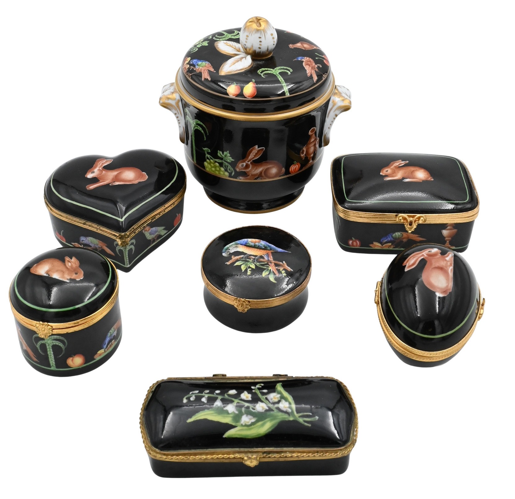 to include small lidded cache pot, egg form trinket box, heart form box, two round boxes along with two rectangular boxes each in black ground with hand painted rabbits, birds, flowers, and fruit, each marked on base