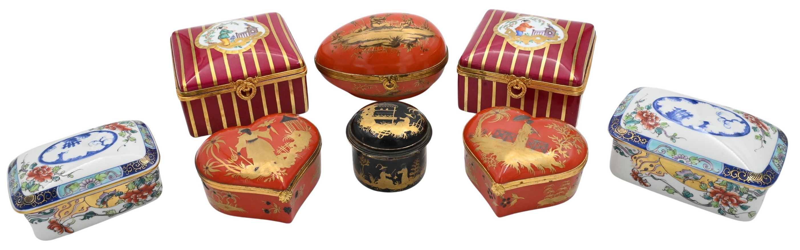 to include larger rectangular trinket boxes with Chinese dragon and chariot design and gilt accents along with three small pill boxes marked Tiffany and Company and Limoges, etc.