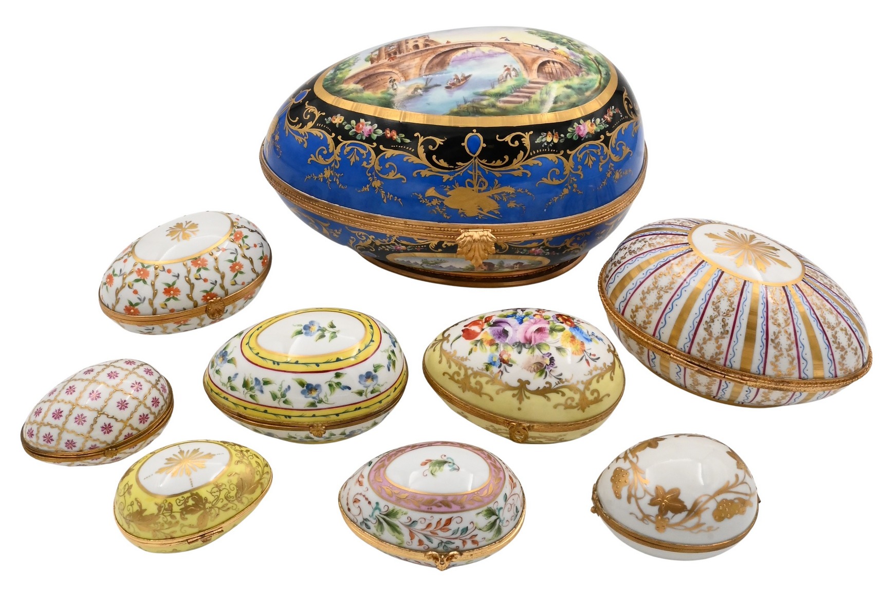 Eight Le Tallec Porcelain Covered Egg Form Bowls, Some Tiffany and Company