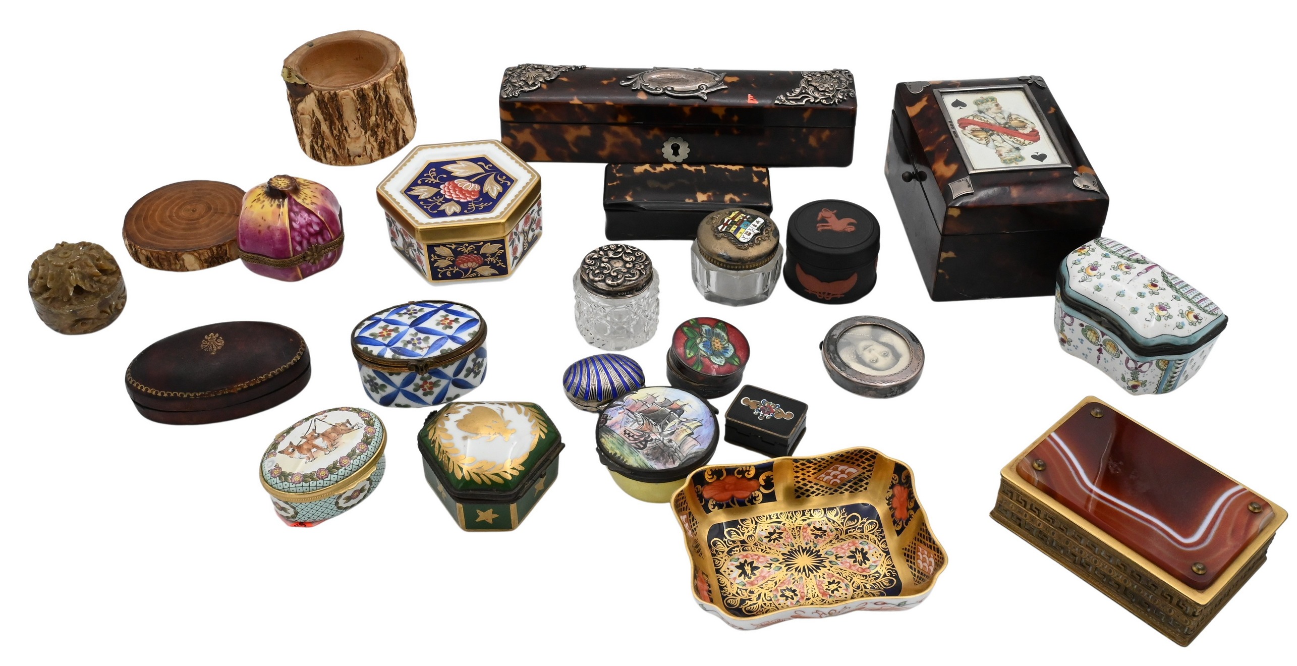 to include three tortoise shell boxes (two silver mounted), two Royal Crown Derby Imari pattern, Halcyon Days for Tiffany pill box, carved amber, cloisonne, small round sterling picture form, etc.