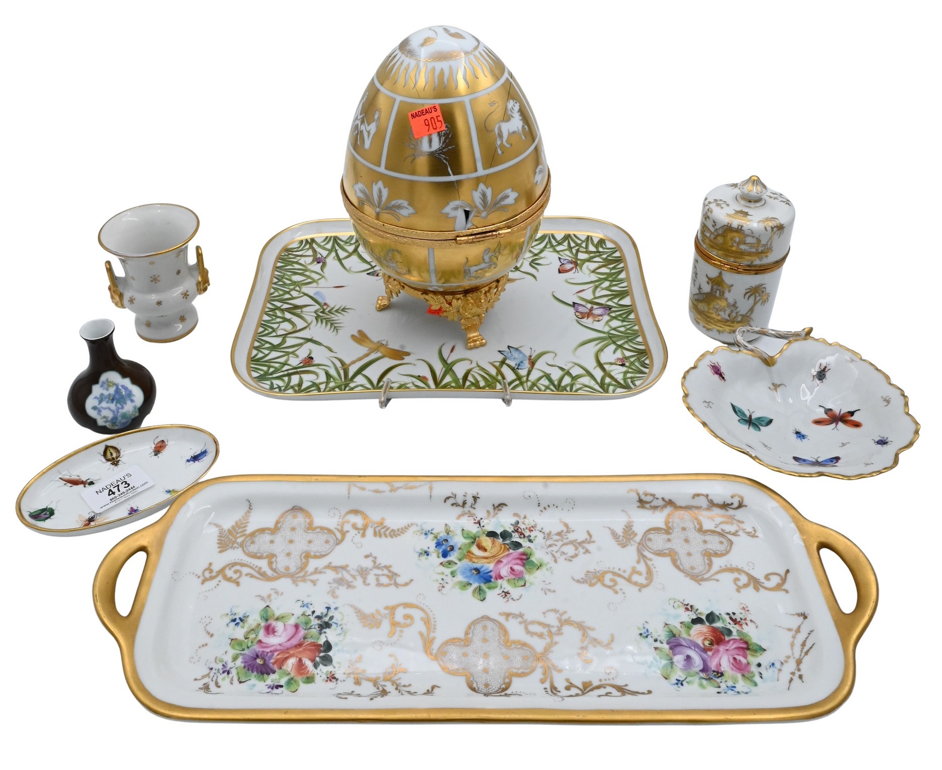 to include Tiffany & COmpany rectangular “Jardin” private stock tray with hummingbirds, dragonflies, butterflies in the grass, large Tiffany “Horoscope” gilt zodiac egg, ormolu mounted (cracking throughout)