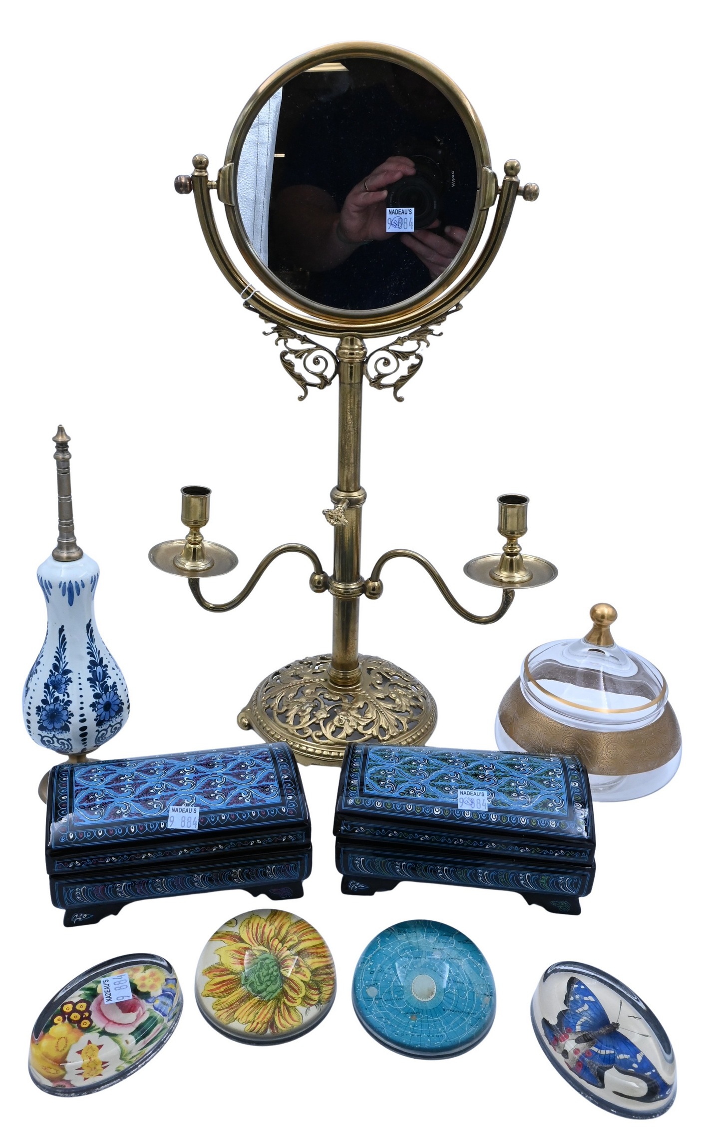 to include Victorian brass shaving mirror with candle stand, two blue and black Indian lacquered boxes, delft finial with brass fitting, four John Derian glass paperweights (dome flower, “blue universe” constellations, over butterfly, and oval flowers) gilt glass covered candy dish