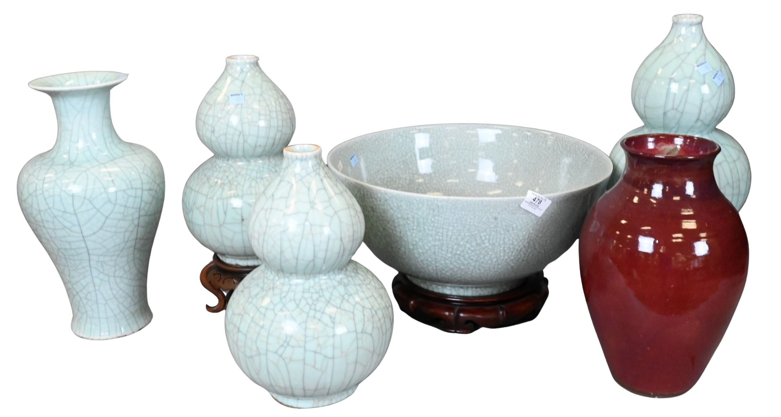to include three Tozai double gourd vases one of baluster form, one large punch bowl, all in celadon crackle glaze along with oxblood red glaze vase signed illegibly and stamped stein