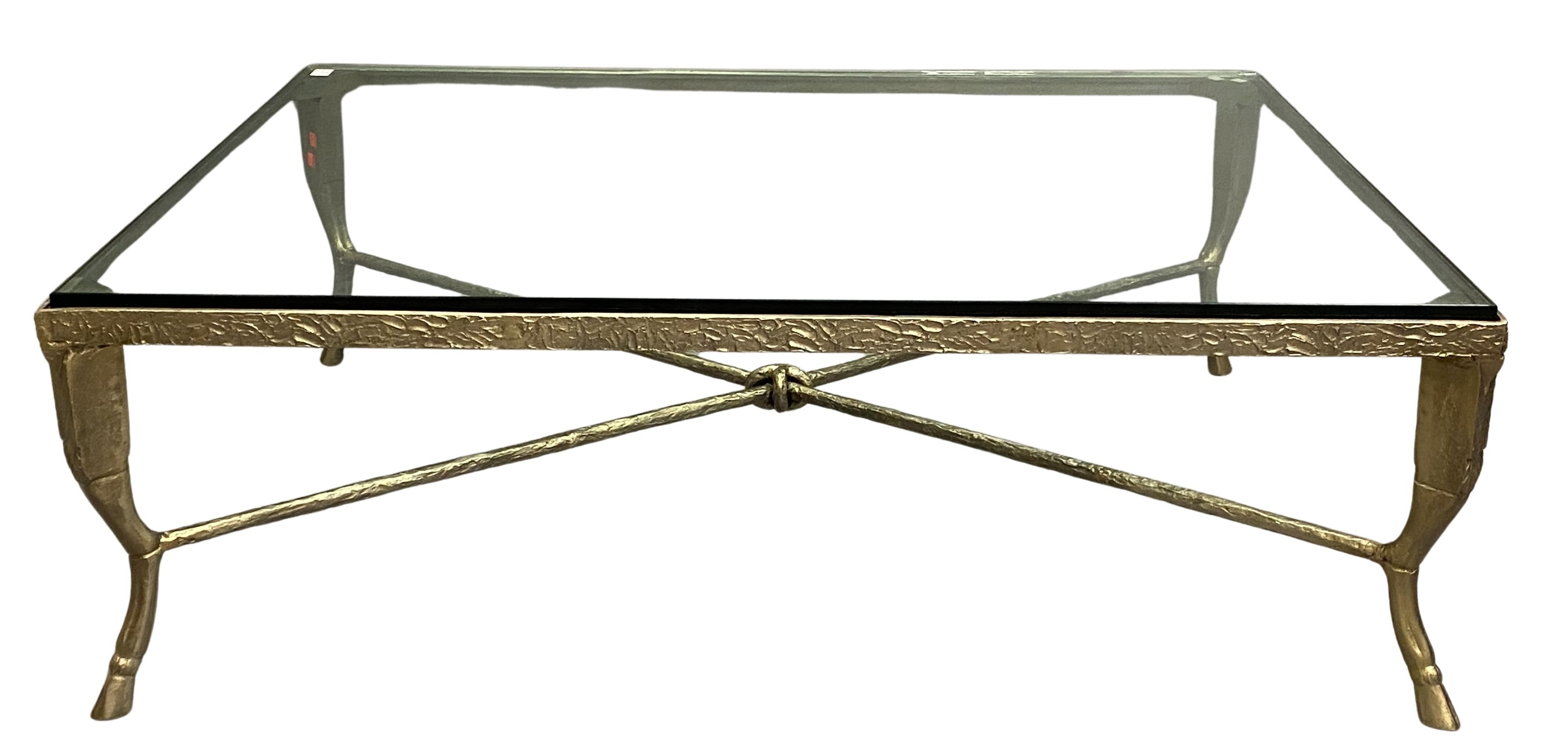 glass top raised on silver painted and hammered hoof fet, X form stretcher with center knot