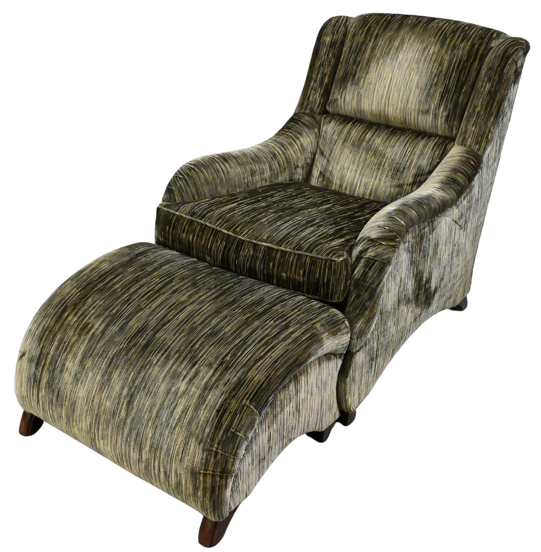 model 111, having carved fluted framework, scrolling arms, nailhead accents, and four feet ending in brass casters