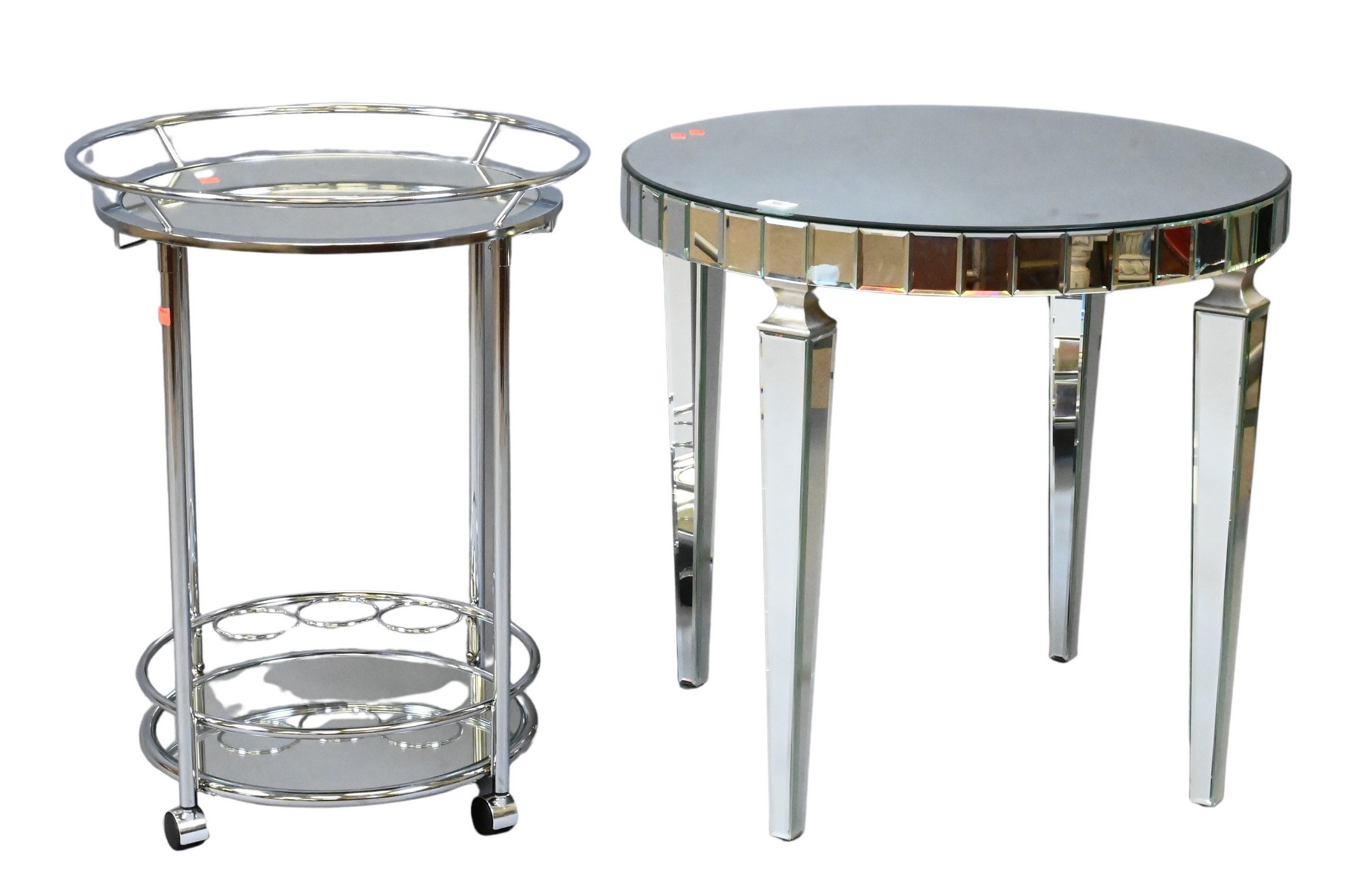 round top side table having chanel set beveled glass rim over square tapering legs with silver painted joiner, along with contemporary chrome and glass two tiered bar cart