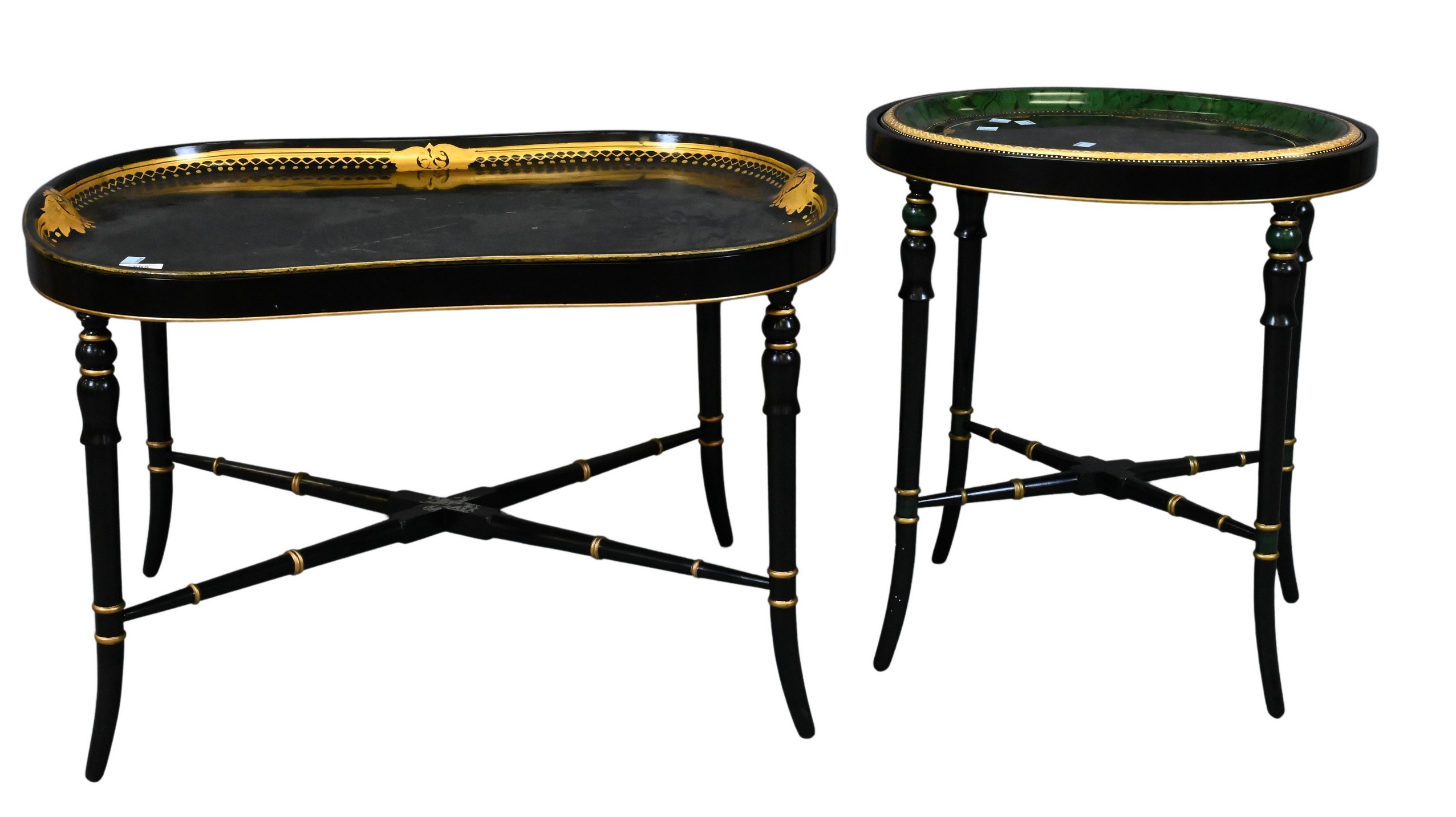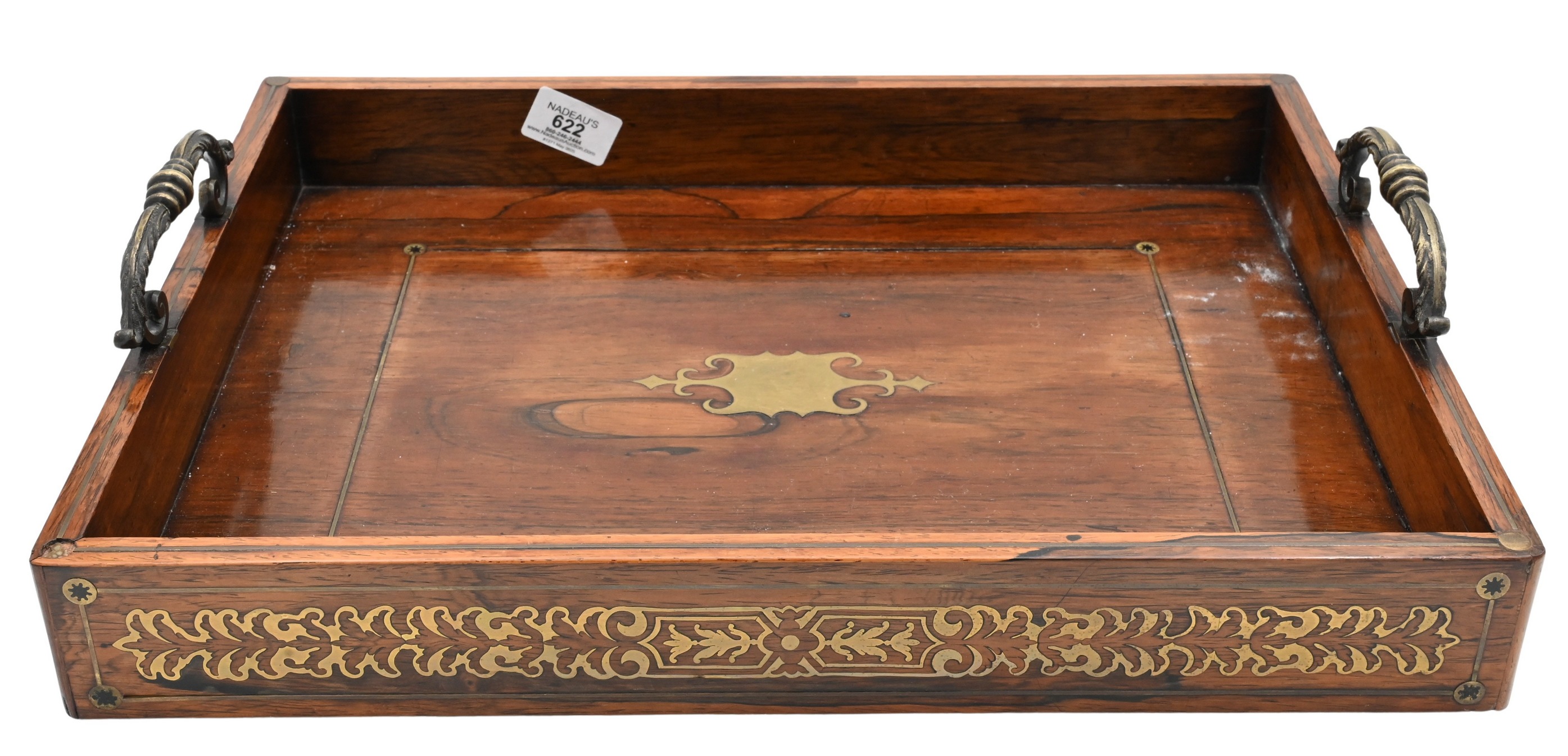 rectangular tray with high gallery having fine brass foliate inlaid border surmounted by scrolling handles, green felt underside