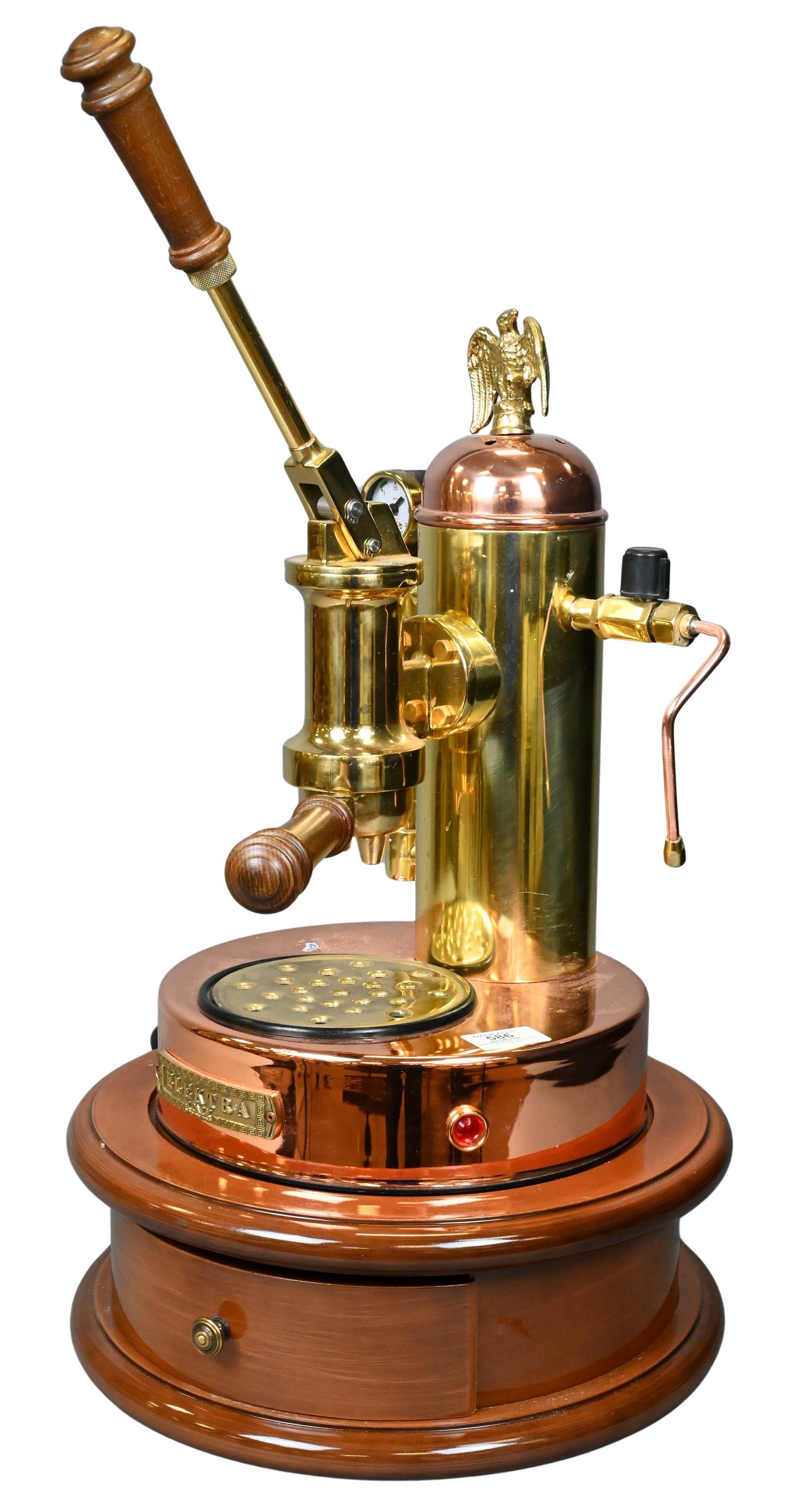 Italian retro style featuring eagle finial, pressure gauge, 1.8 liter boiler, and spring piston lever operation, mounted on stand with drawer, model: Micro Casa Art S1H.