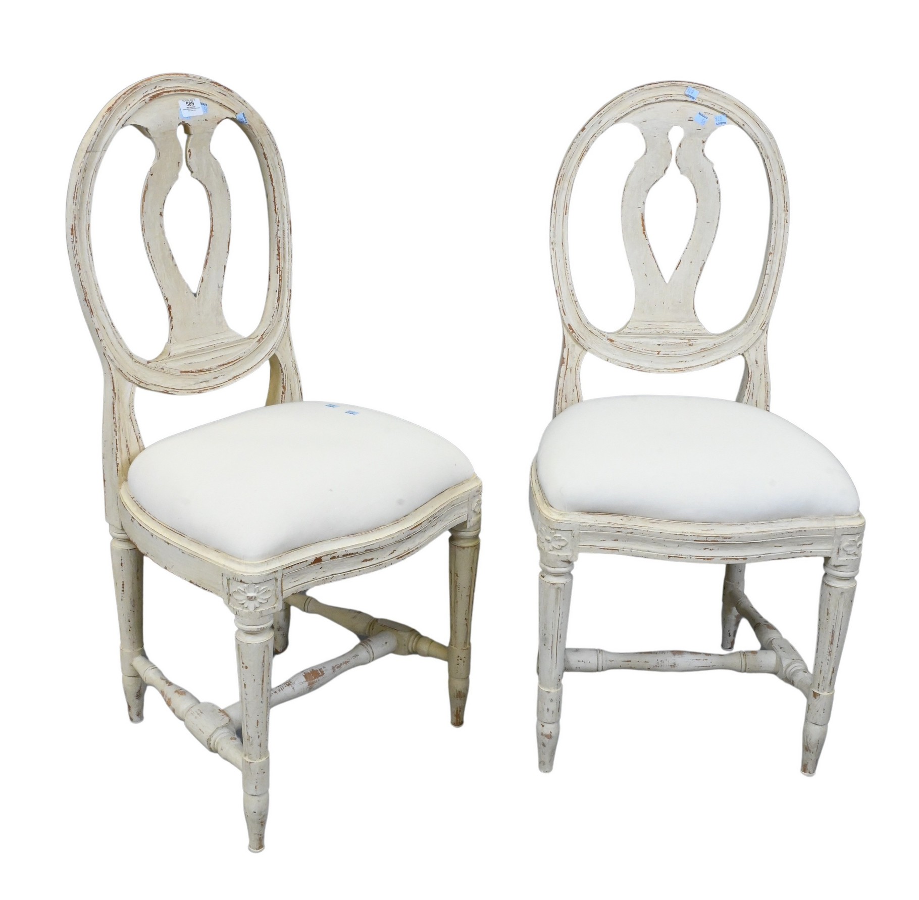 carved and painted frame having open urn form oval back, custom upholstered cushion set on H stretcher cross bar and turned legs