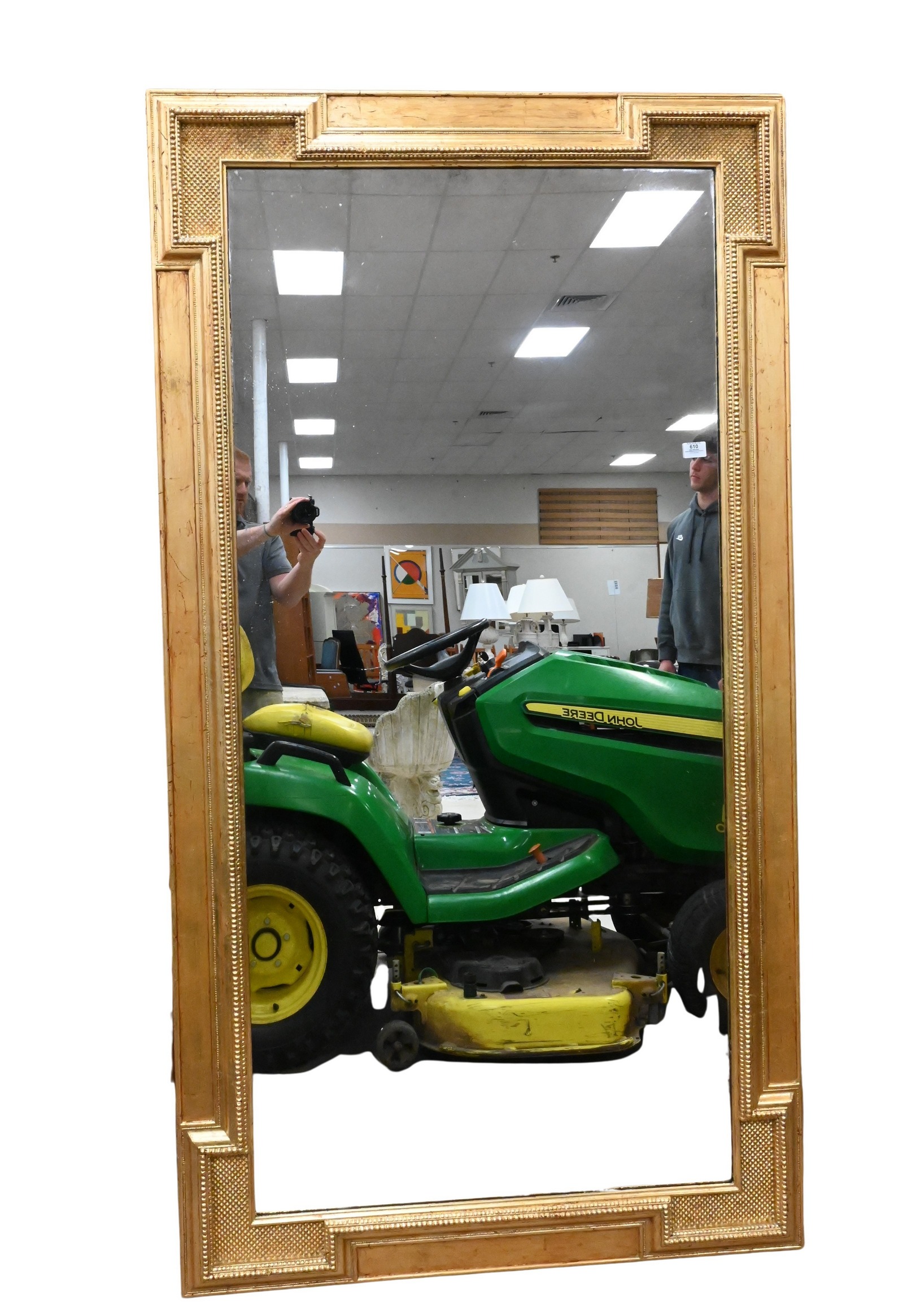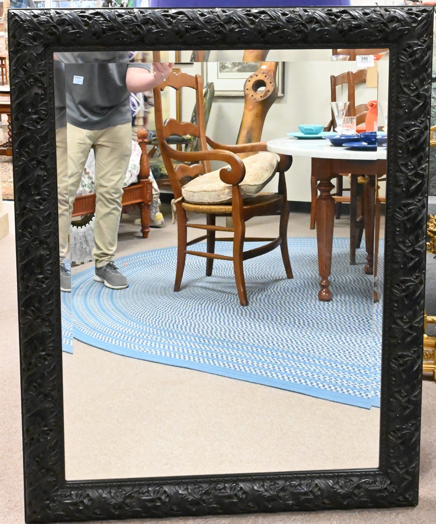 rectangular beveled glass mirror having carved and ebonized berry and leaf motif frame, label on verso