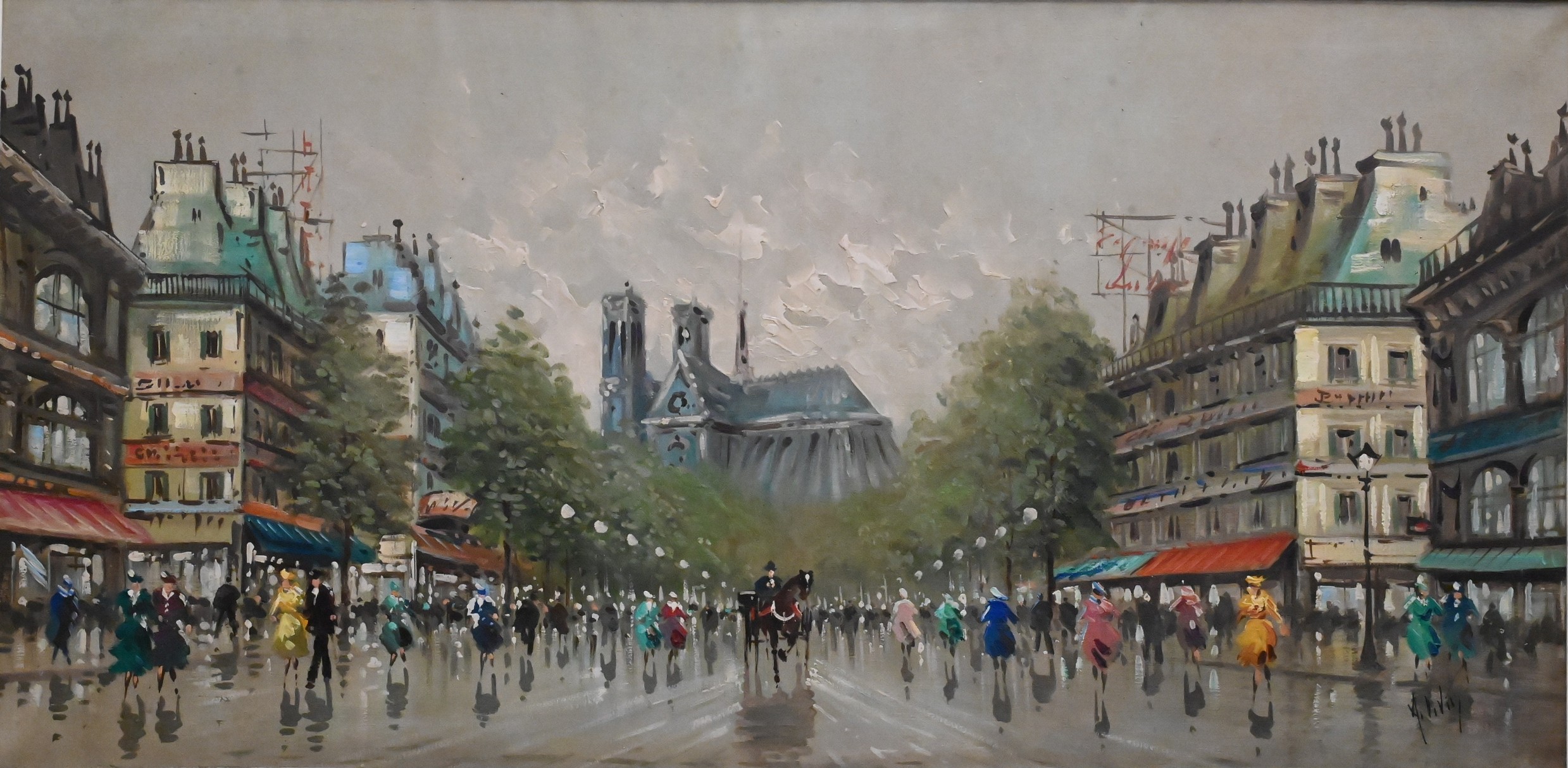 Parisian street scene featuring Notre Dame Cathedral in the distance