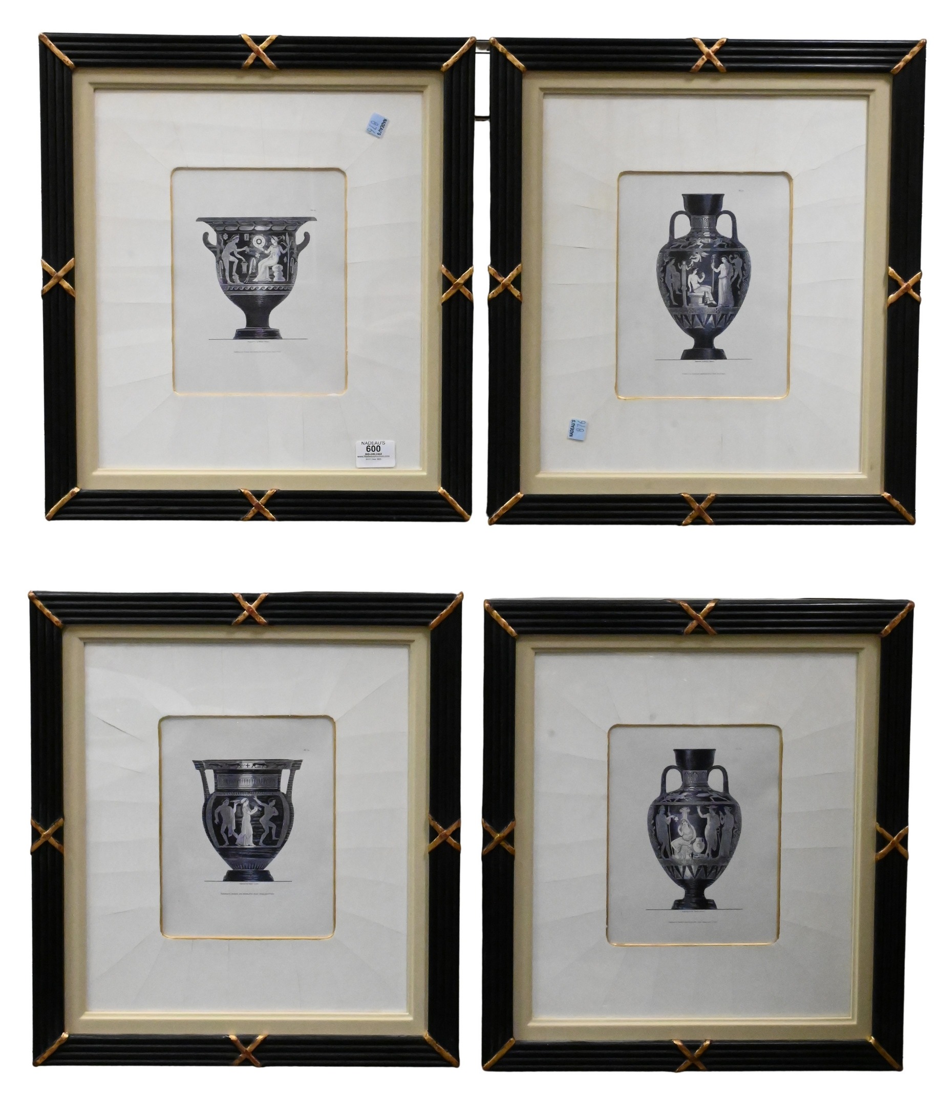 to include plate No. II, No. 24, No. 17, and No. 19 each depicting various Greek/Roman vases with friezes etchings, each in ebonized and pavel gilt frames