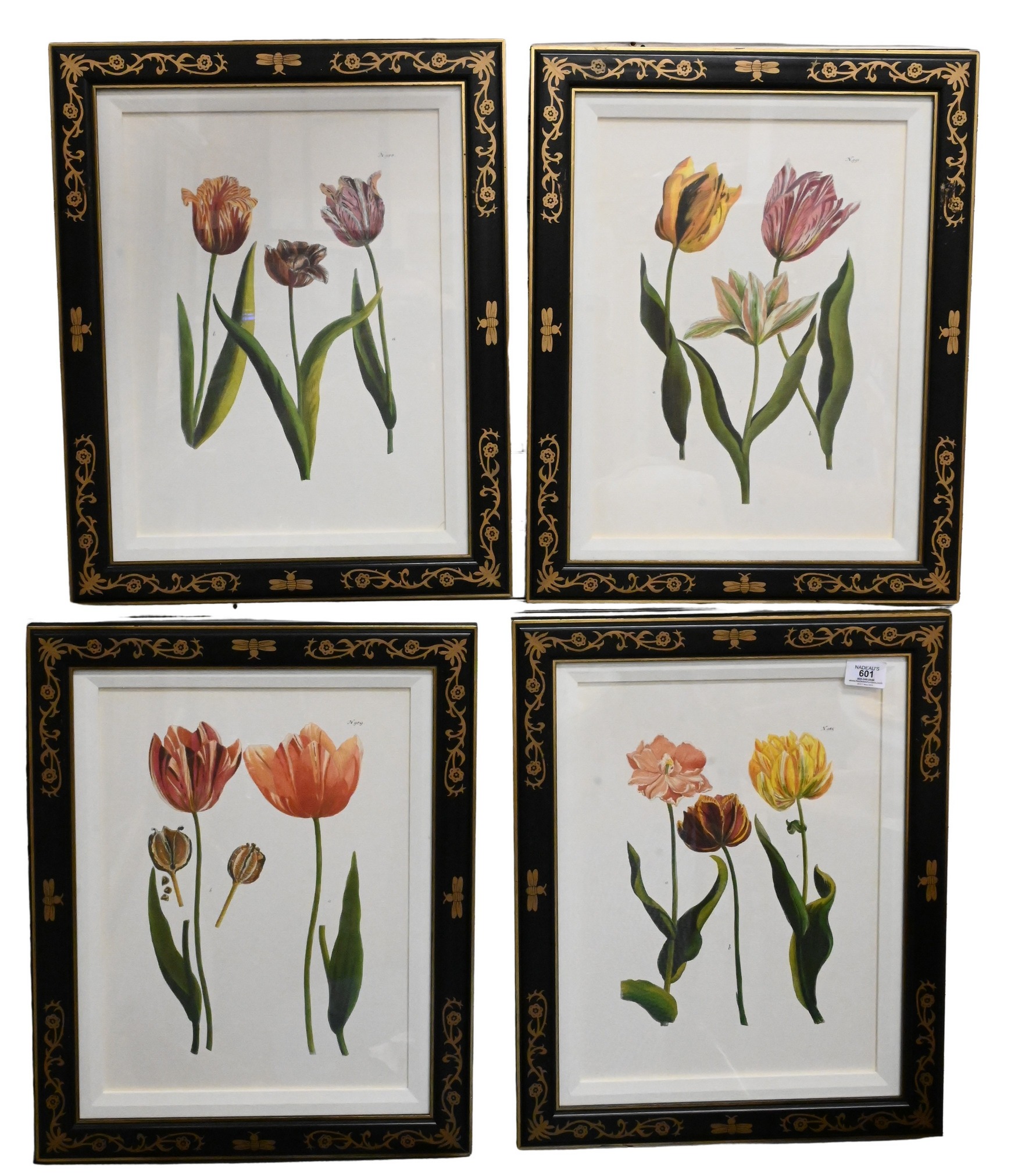 Offset lithographs on laid paper in ebonized and gilt bumble bee frame along with two smaller tulip prints in ebonized and scrolling gilt folate frame