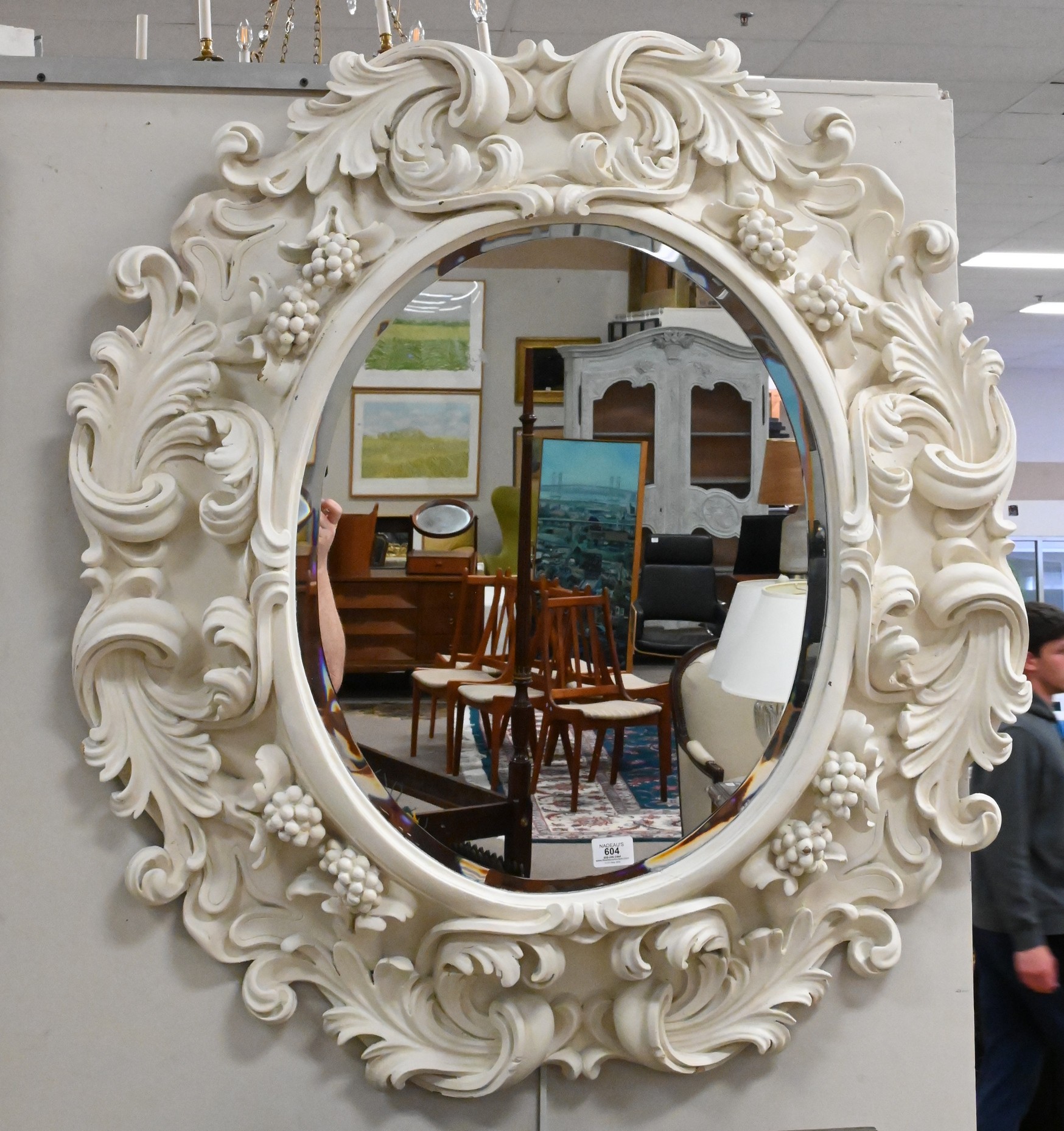 having molded scrolling follicle and flower white painted frame centered by oval beveled glass mirror, label on verso