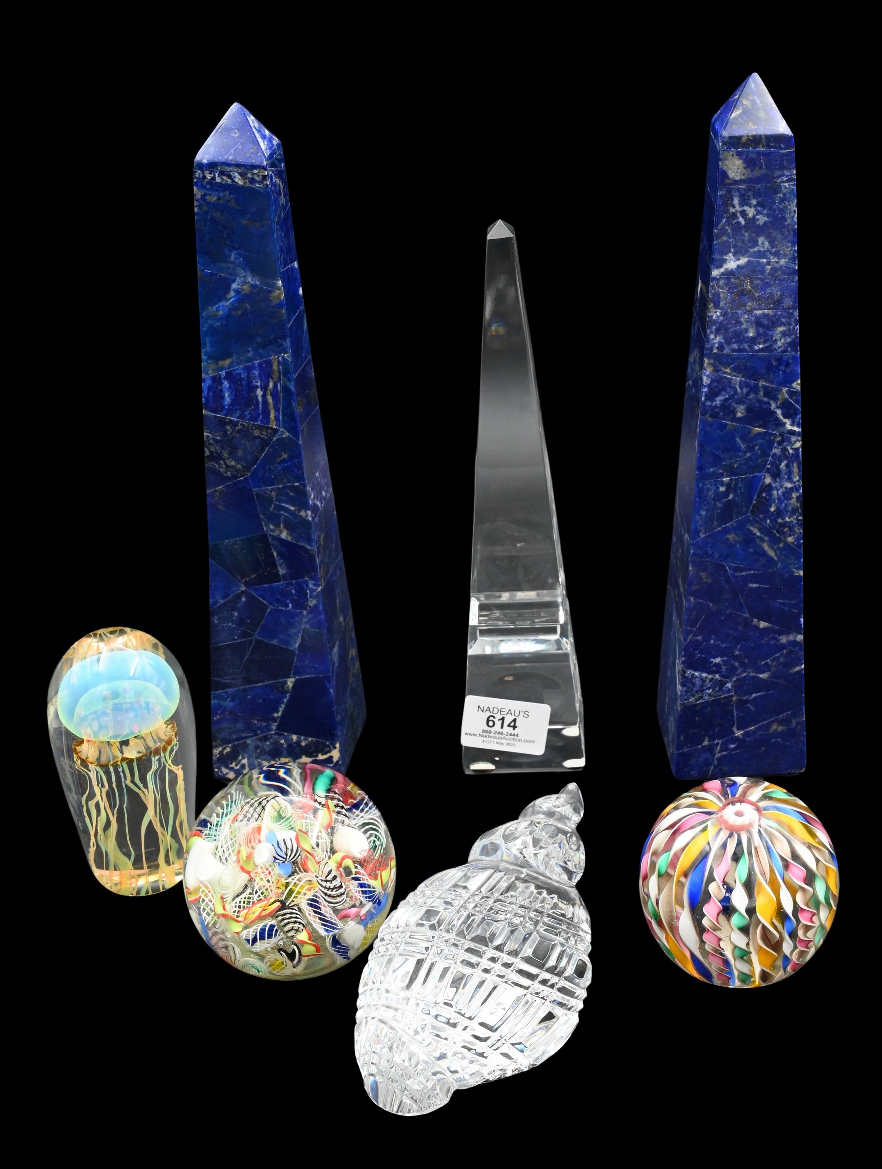 to include Richard Satava moon jellyfish art glass marked Satava 1829-09, pair of Lapis Lazuli blue veneer obelisks, crystal baccarat obelisk, waterford crystal shell paperweight, and two blown glass paperweights