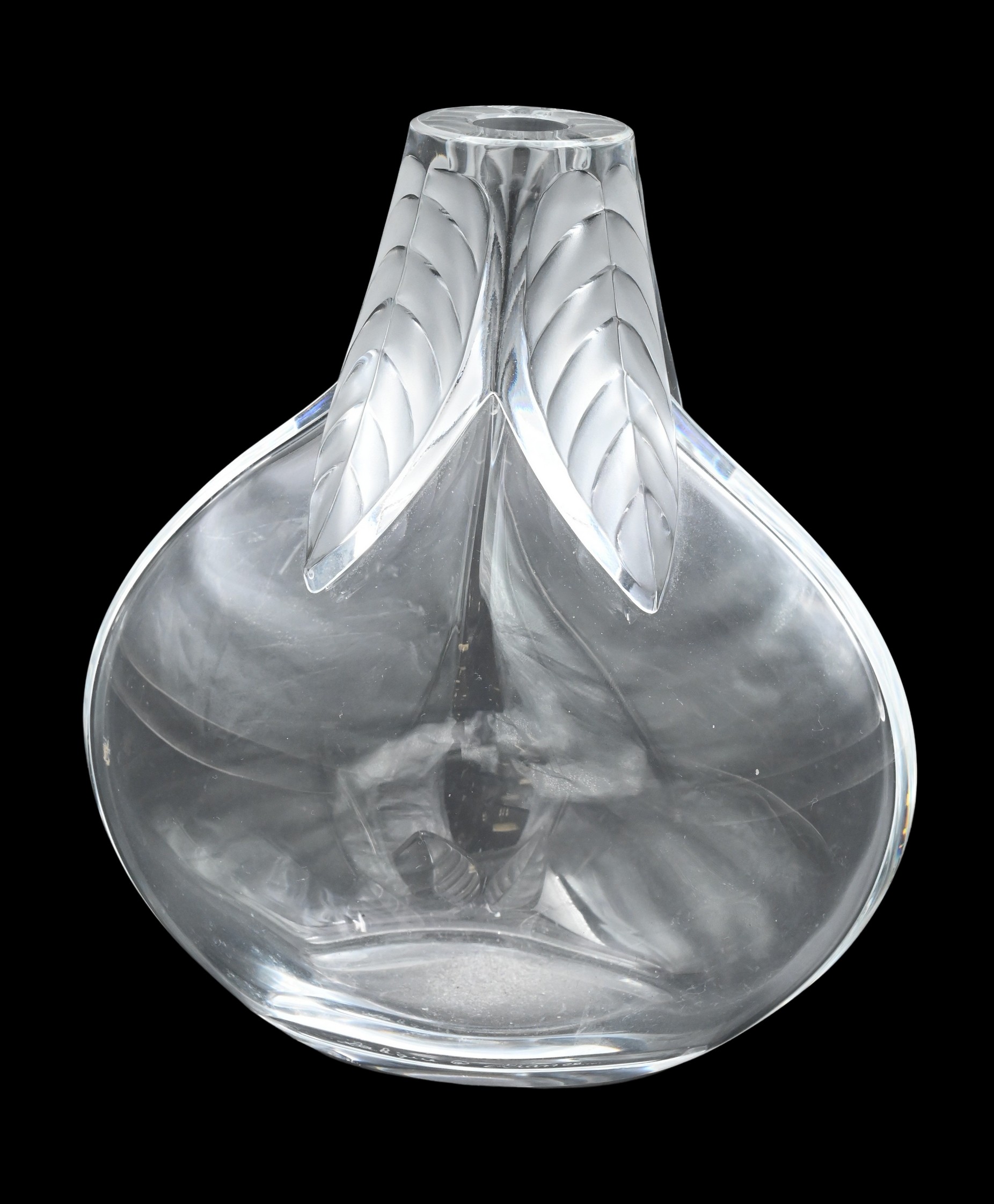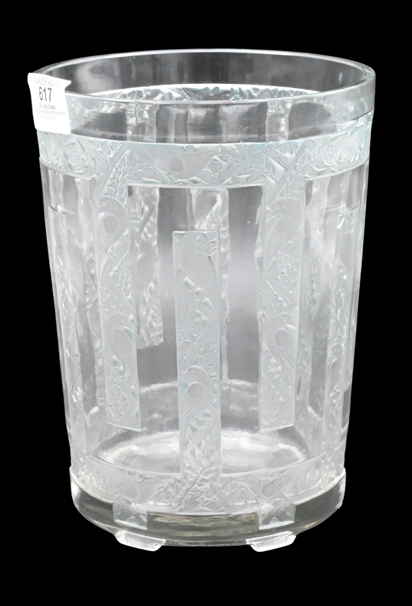clear and frosted light blue glass vase having Greek key and bird motif, etched stamp R. Lalique France circa 1926