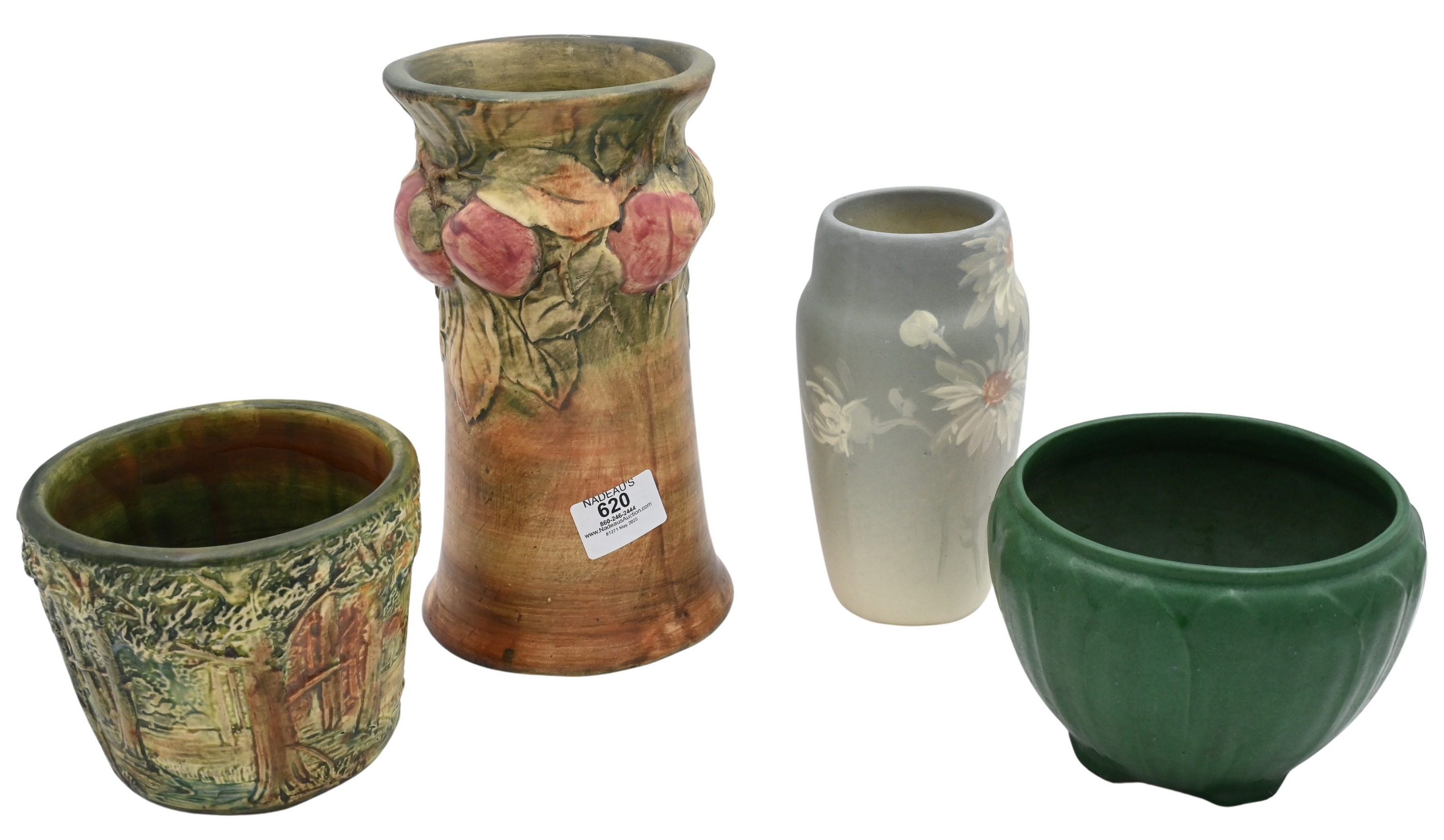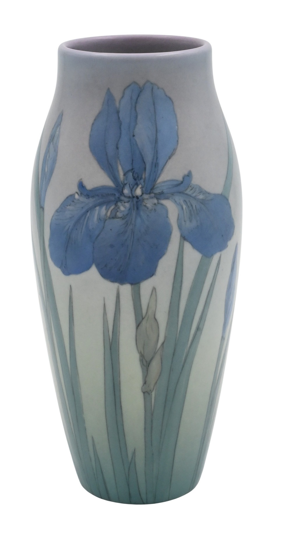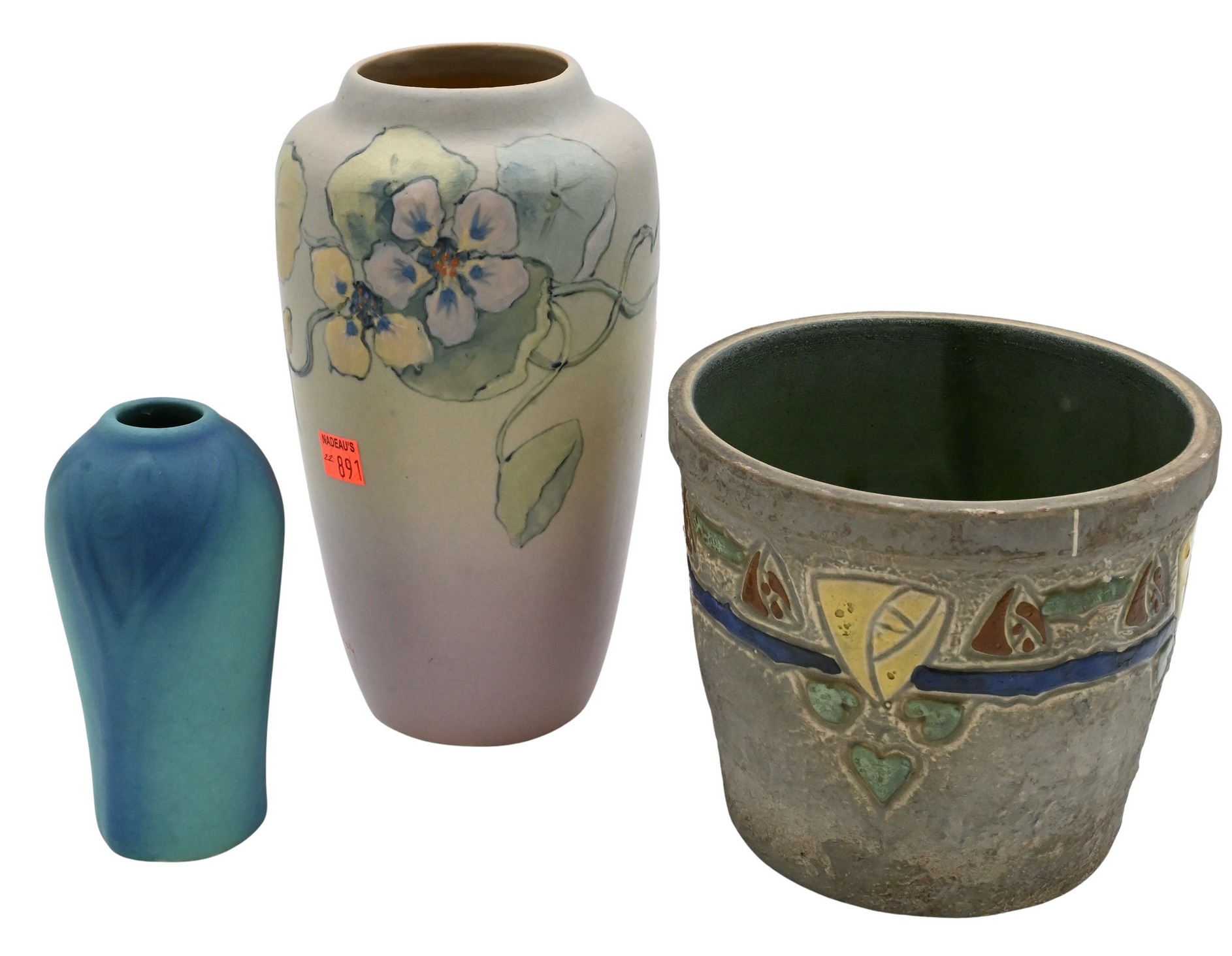 to include Van Briggle blue floral vase with matte iris design signed, Rookwood Nasturtium vase, Roseville “Mostique” planter or jardiniere