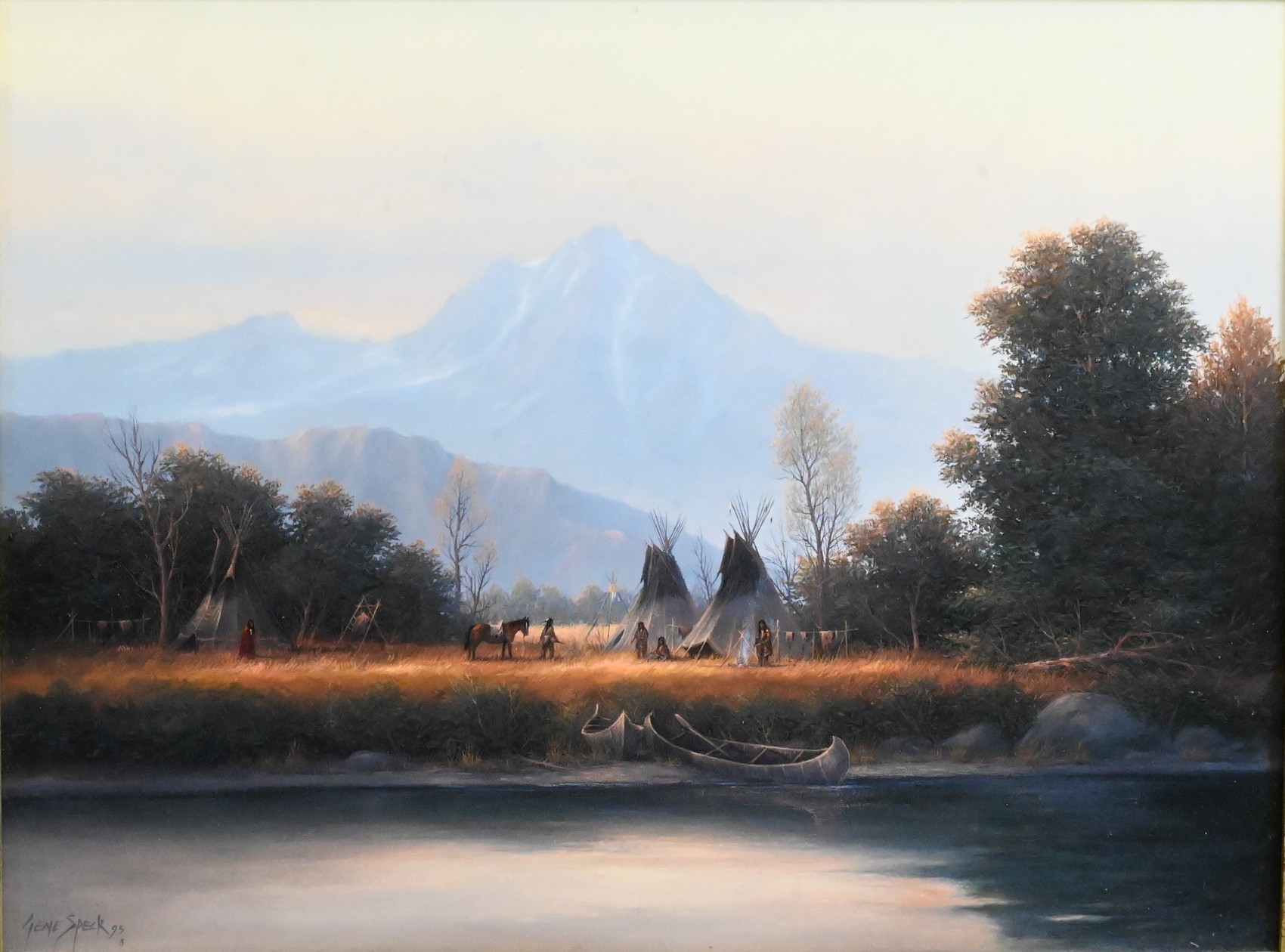 Landscape with Native American tribe with teepees and canoes in front of mountains