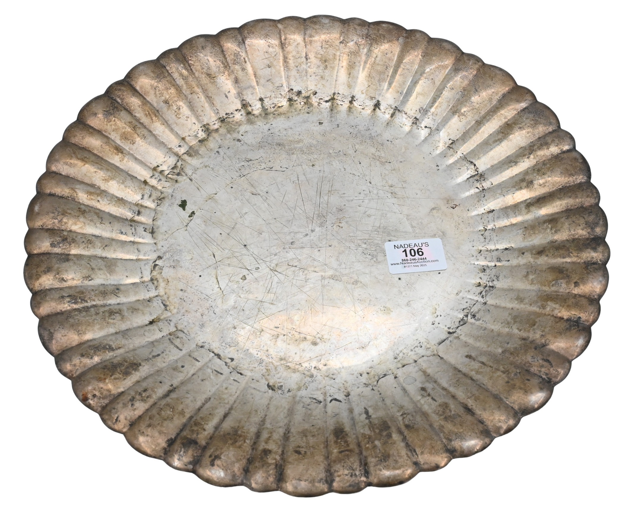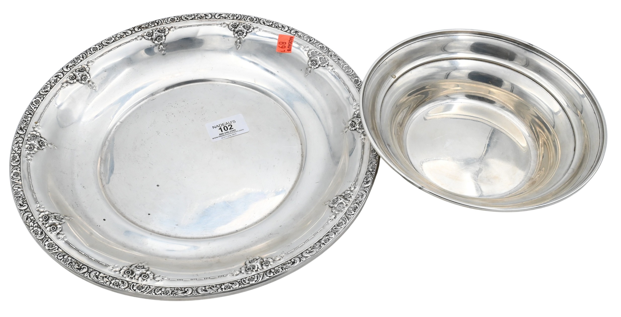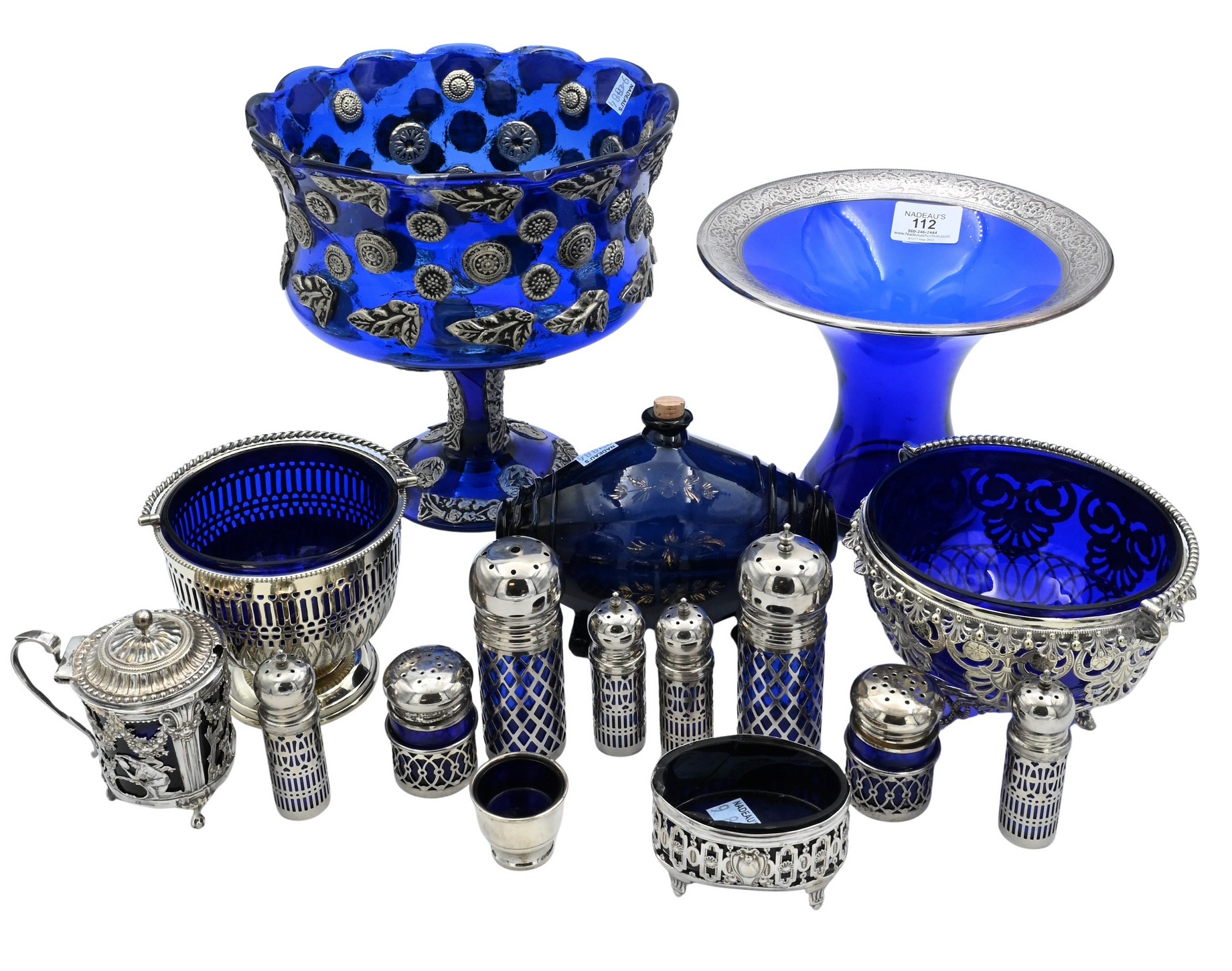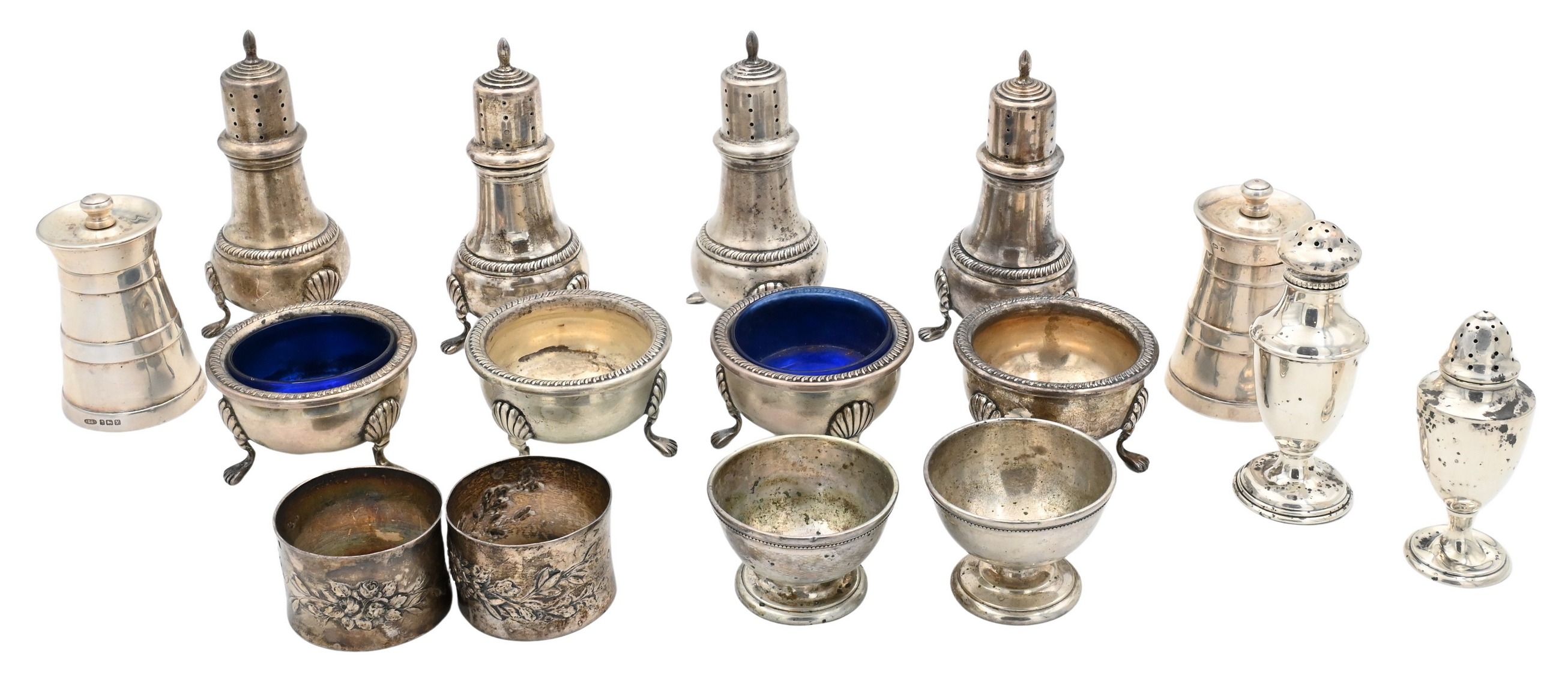 to include large center bowl with silvered floral design, continential silver small openwork oval sugar with liner and lidded mustard cup, pair of small sterling salt cellar, along with eight silver plate salt and pepper barrel form containers, two openwork handled basket sugar bowls, and, trumpet form vase with repousse rim, center dish 9 inches, total weight of silver 4.7 t.oz