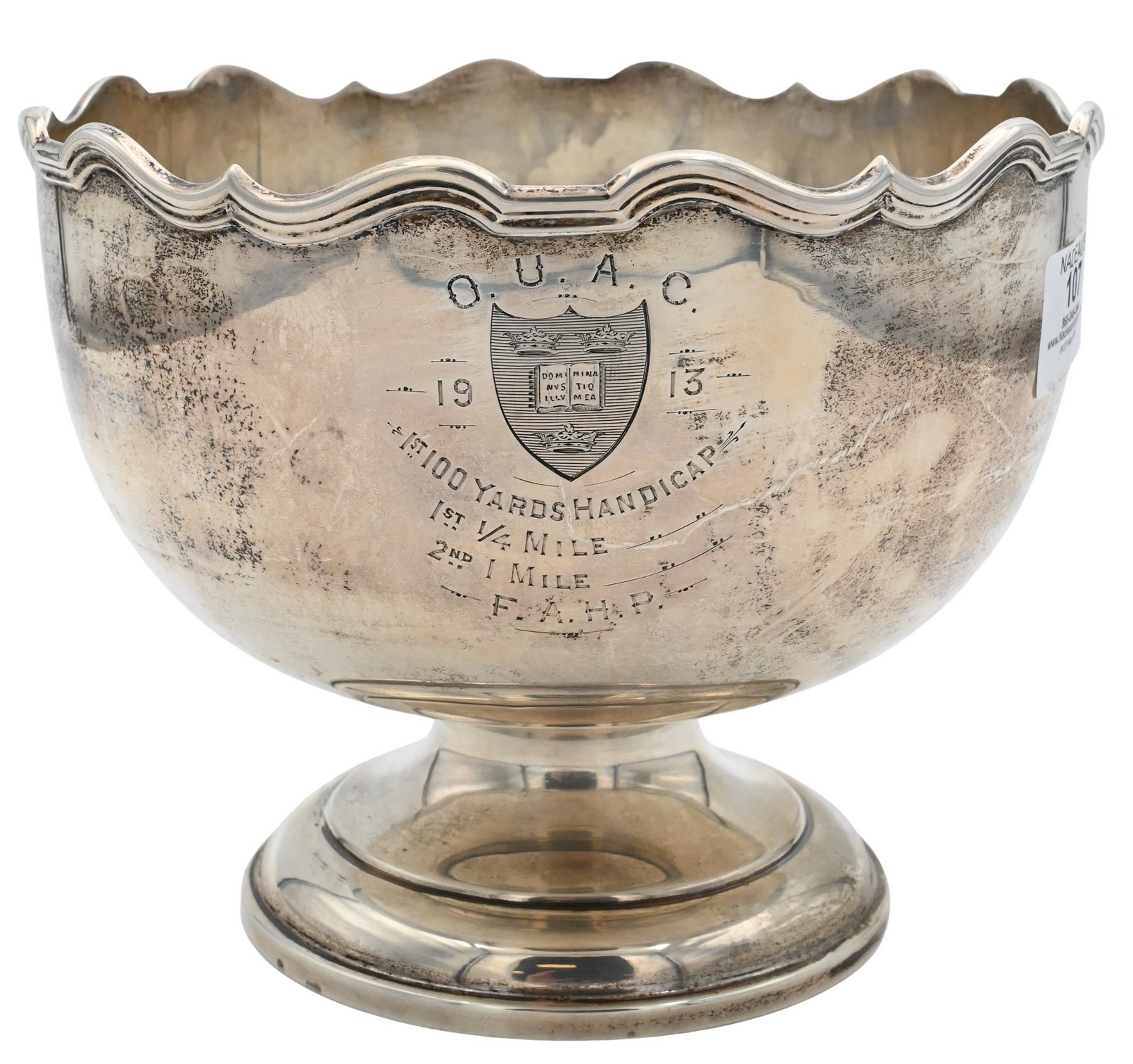inscribed “O.U.A.C. / 1913 / 1st 100 Yards Handicap / 1st 1/4 Mile / 2nd 1 Mile/ F.A.H.P.” made by Hawksworth, Ekre, & Company Ltd. and retailed by Rowell Oxford