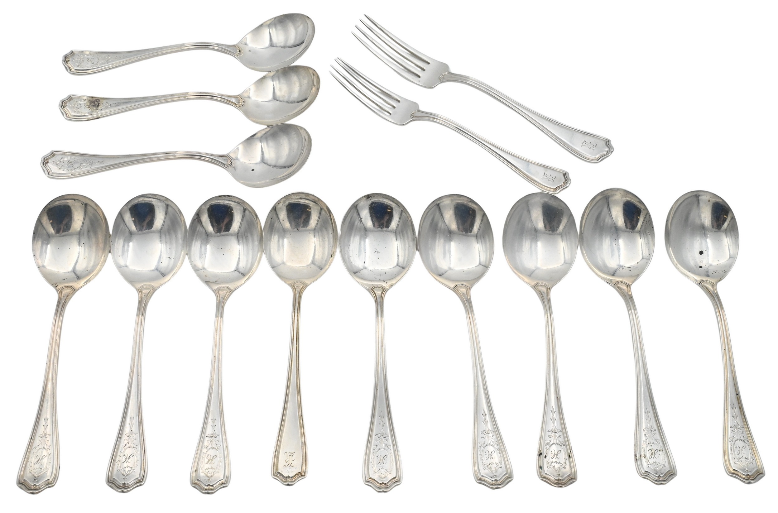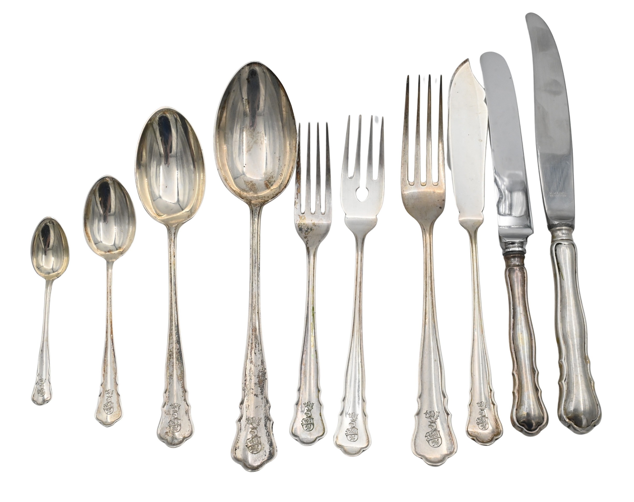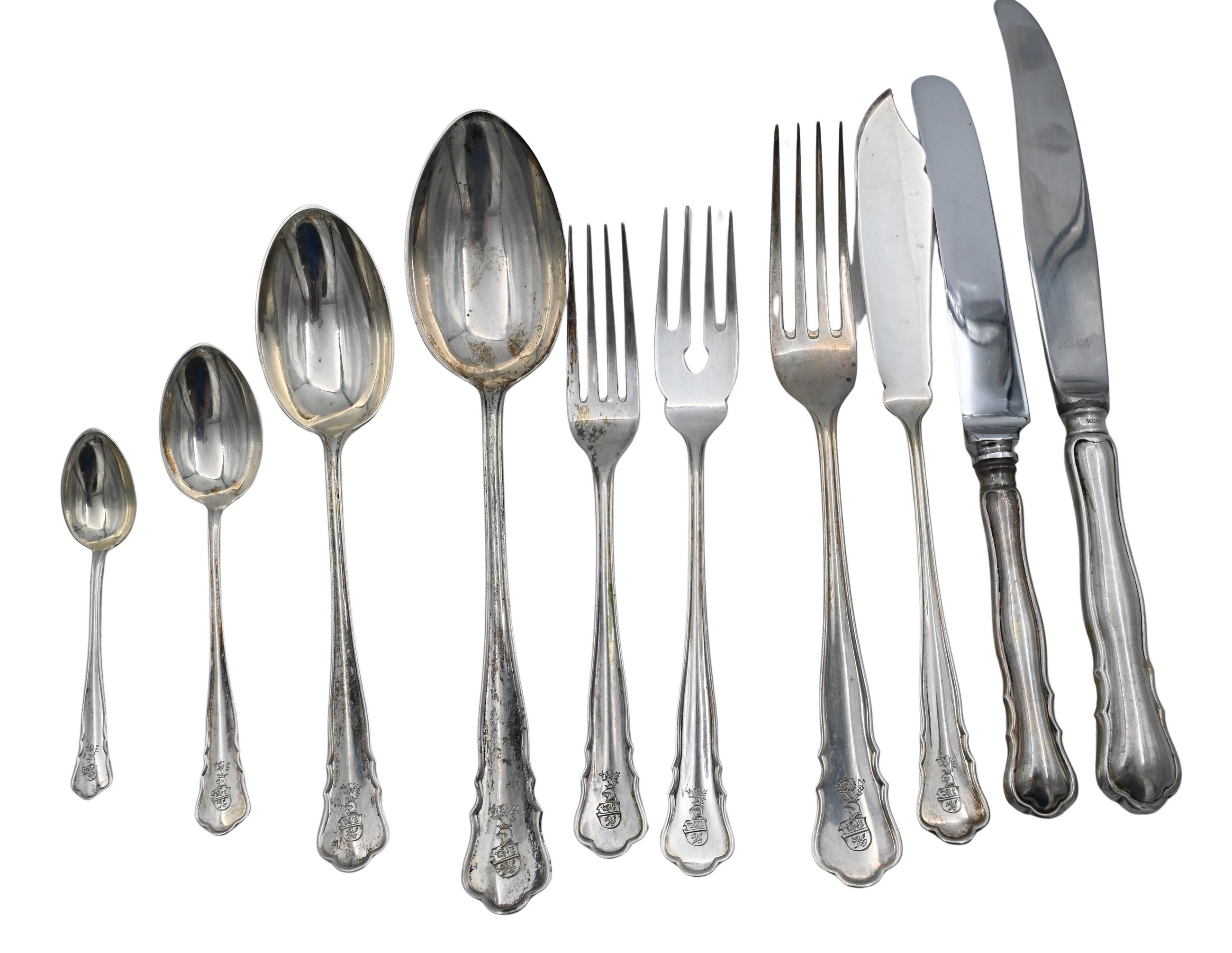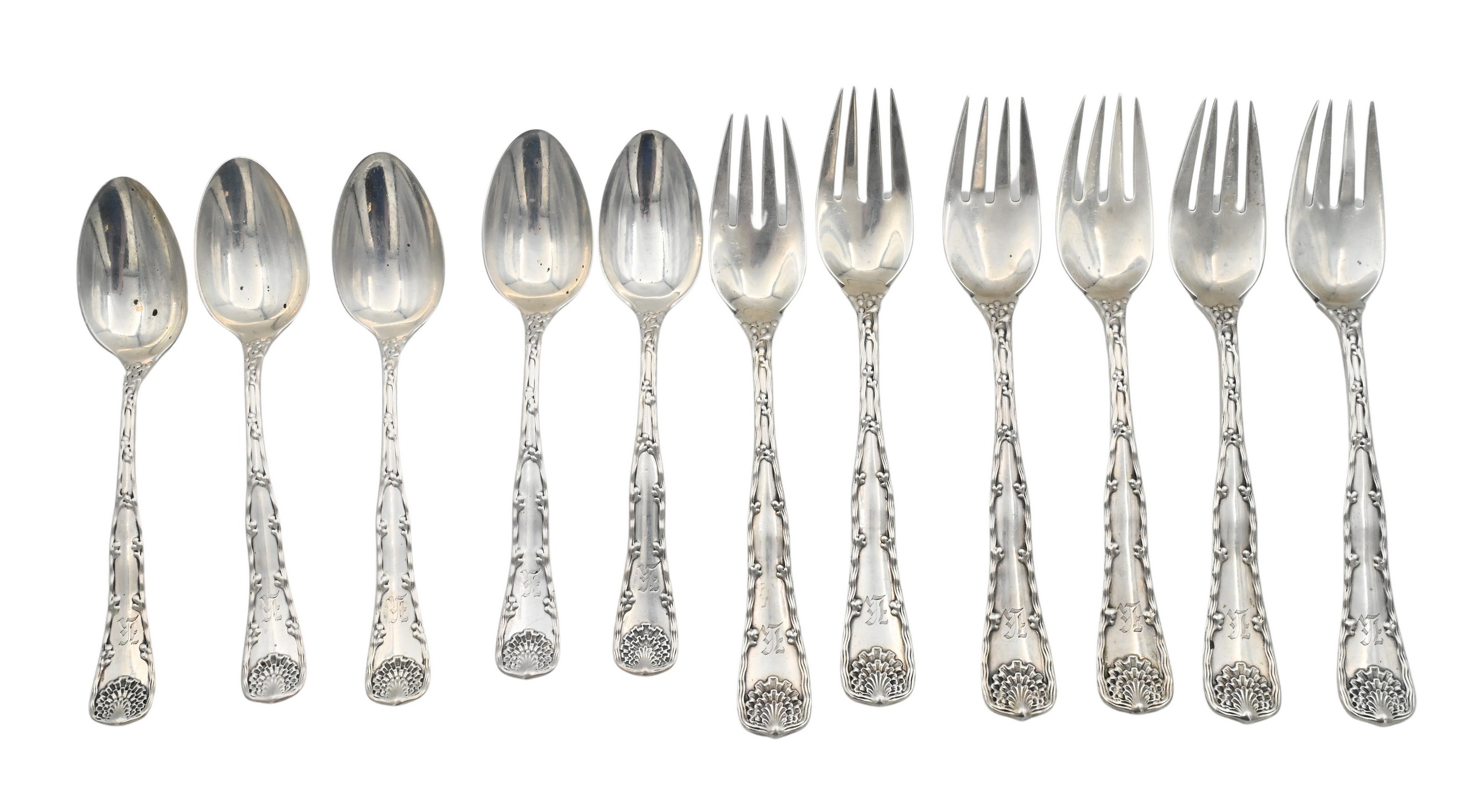 to include six dinner forks, six luncheon forks, six salad forks, six fish forks, four place spoons, six tablespoons, six teaspoons, six bouillon spoons, six demi spoons, six dinner knives, six luncheon knives, six fish knives, six fruit fork, six fruit knives, six lobster picks, six serving pieces