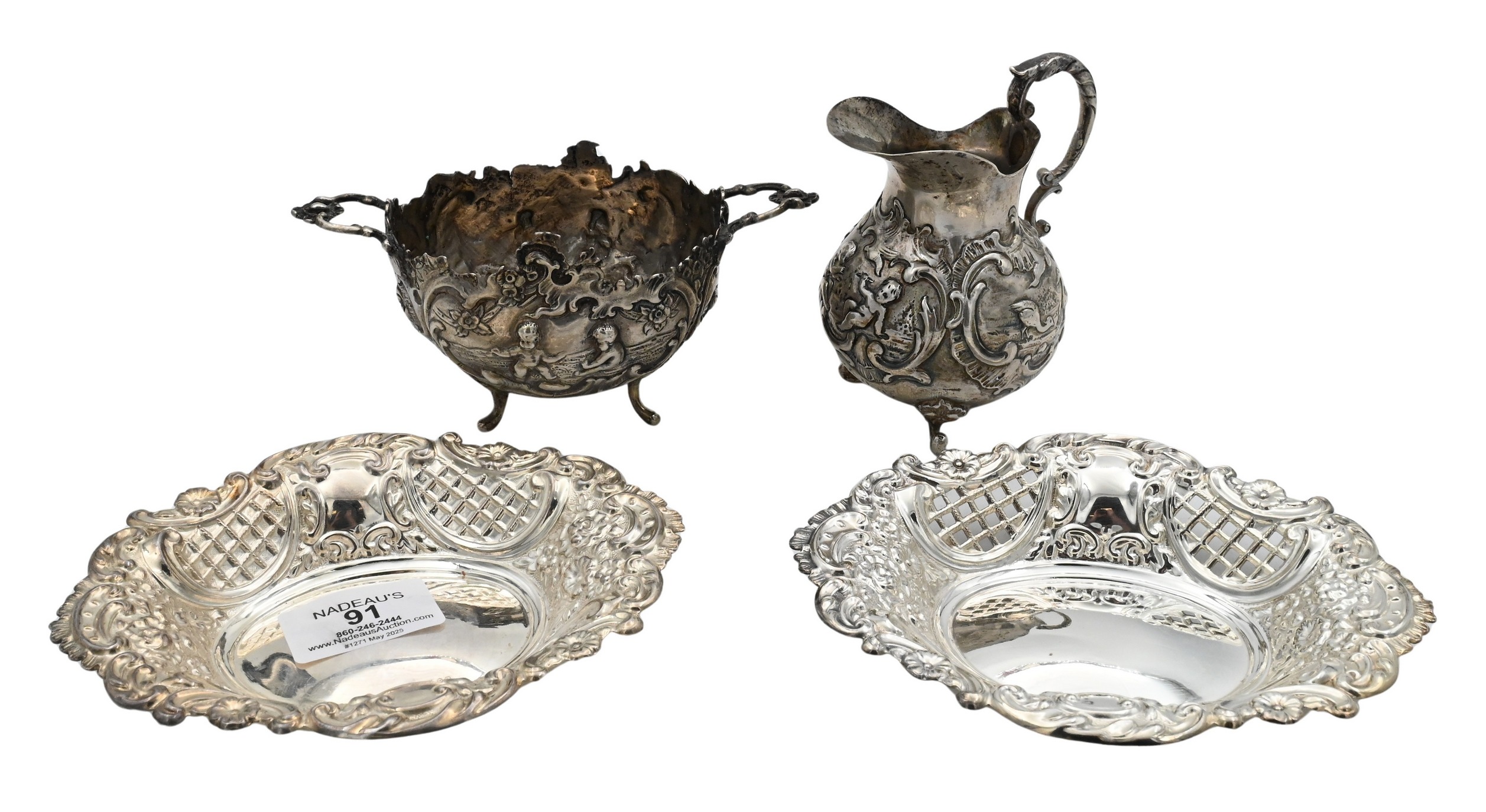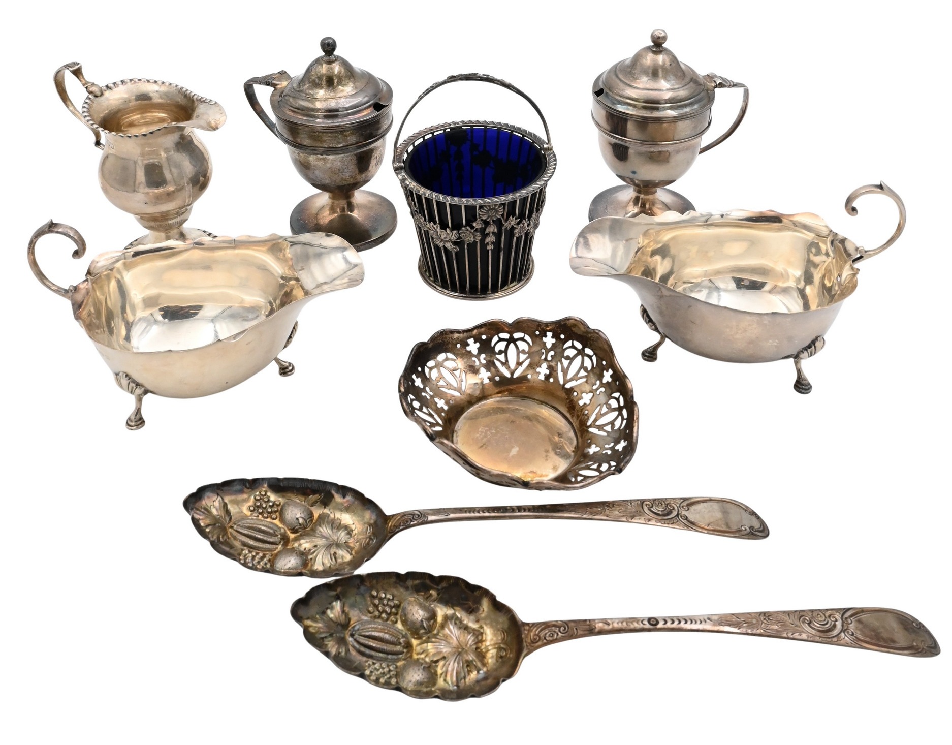 to include a pair of gravy boats, creamer, pair of lidded sugars, pair of repousse spoons, pierced tray and basket