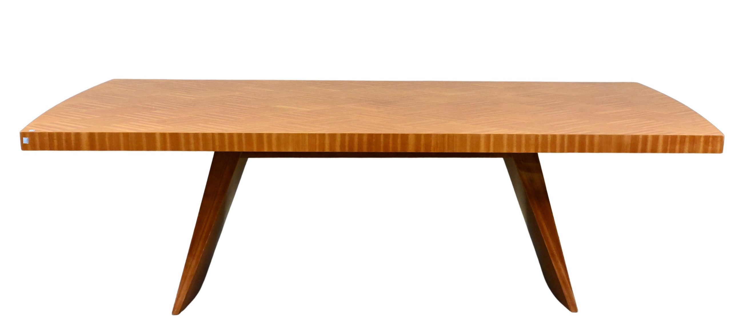 postmodern shape with high glass finish, alternating wood grain inlaid marquetry top set on two flooring legs along with two leaves each 18 x 42, originally purchased $12,000