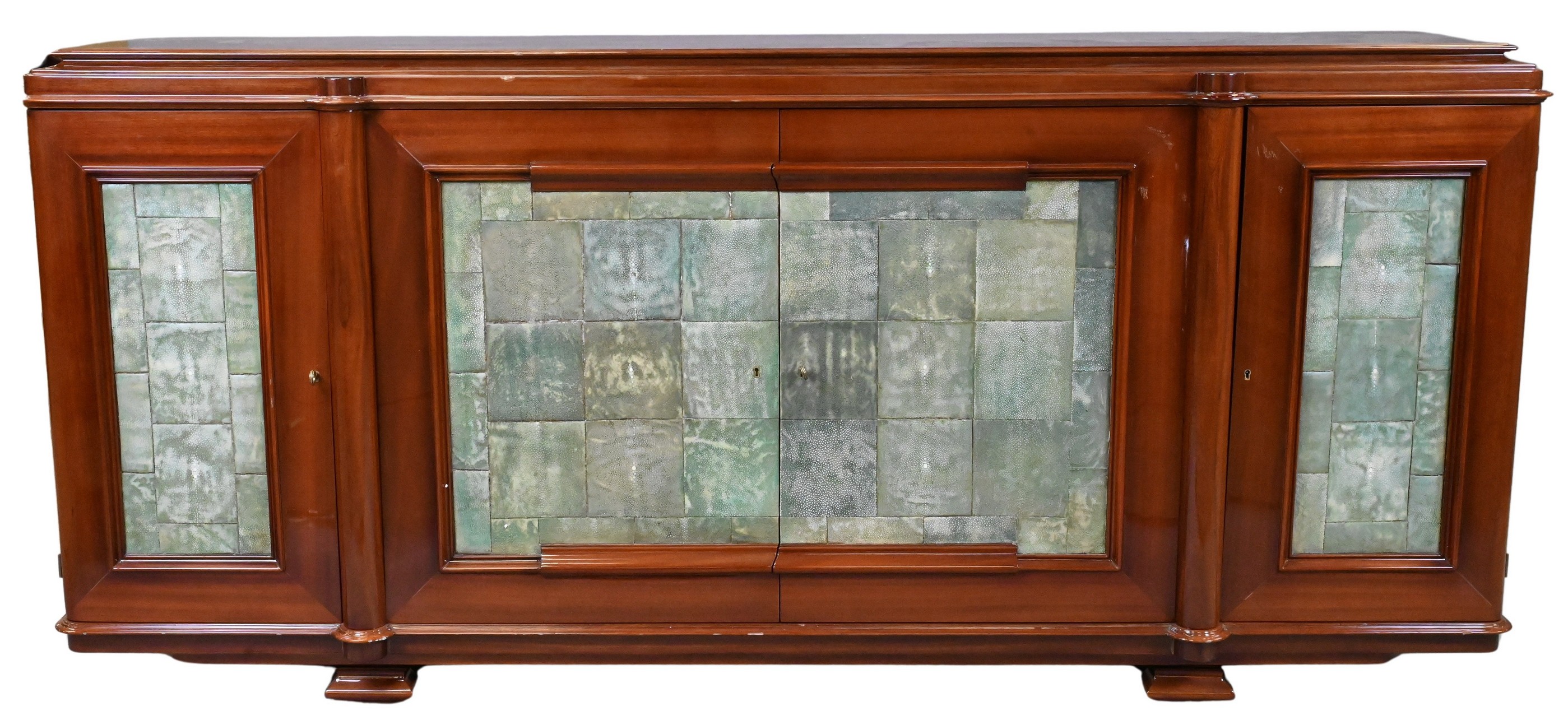 lacquered herringbone inlaid wood frame having two large shagreen paneled center doors flanked by side doors opening to cutlery drawers and shelving