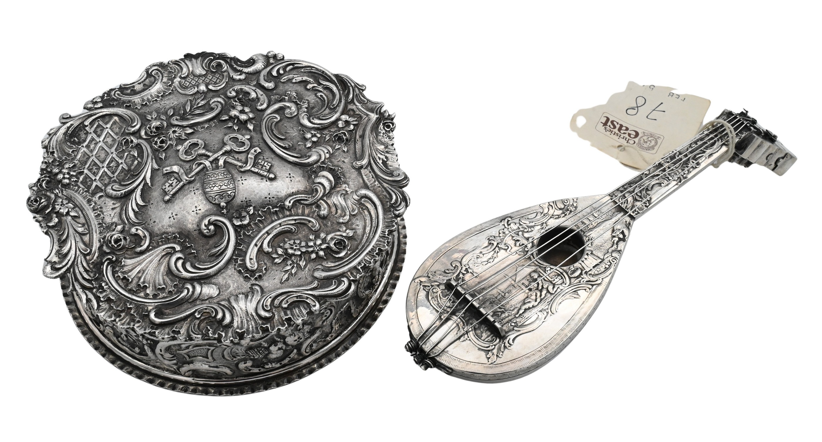 to include repousse lute form having Christie’s East tag lot 78 from February 5th 1987 (8 inches long) and circular box depicting Romulus II Remus, the Imperial Eagle of the Roman Empire, and the papal stakes/ pope’s crest with Christie’s East label lot 303 (5 1/2 inches in diameter)