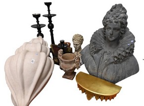 large shell sculpture, large fiberglass bust of a queen, two smaller classical style busts, two carved and gilt wall mounts, putti urn, three ebonized candlesticks