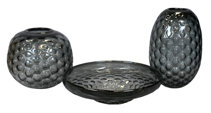 in smoke gray coloring with beehive texture to include tall vase, round vase and center bowl