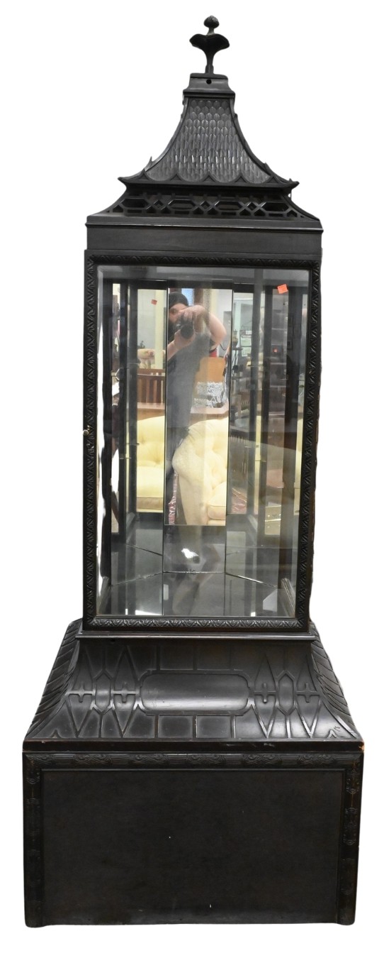 having pagota top set above large door opening to glass shelves with mirrored back and base; interior electrified