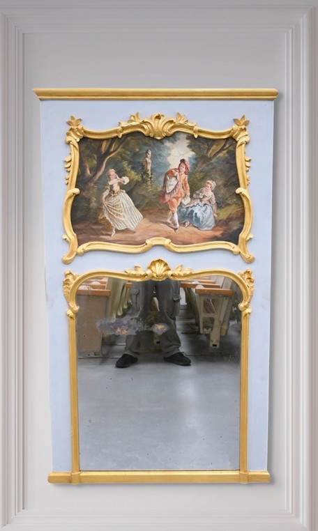 top having oil on canvas depicting a young man and two court ladies in a garden landscape over bottom mirror having rounded top and bordered with carved giltwood scrolling foliate and shell motif