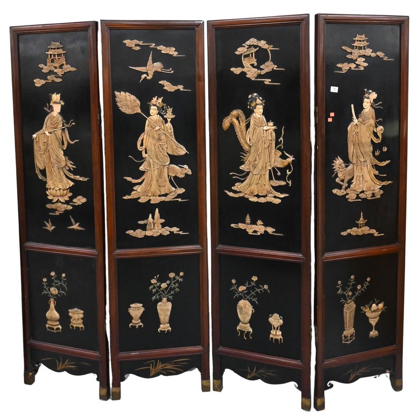 each black lacquered panel having immortals / goddesses amongst clouds, bone insets featuring lotus flowers, cranes, temples, and dragon motif, all over brass capped feet (one face lost)
