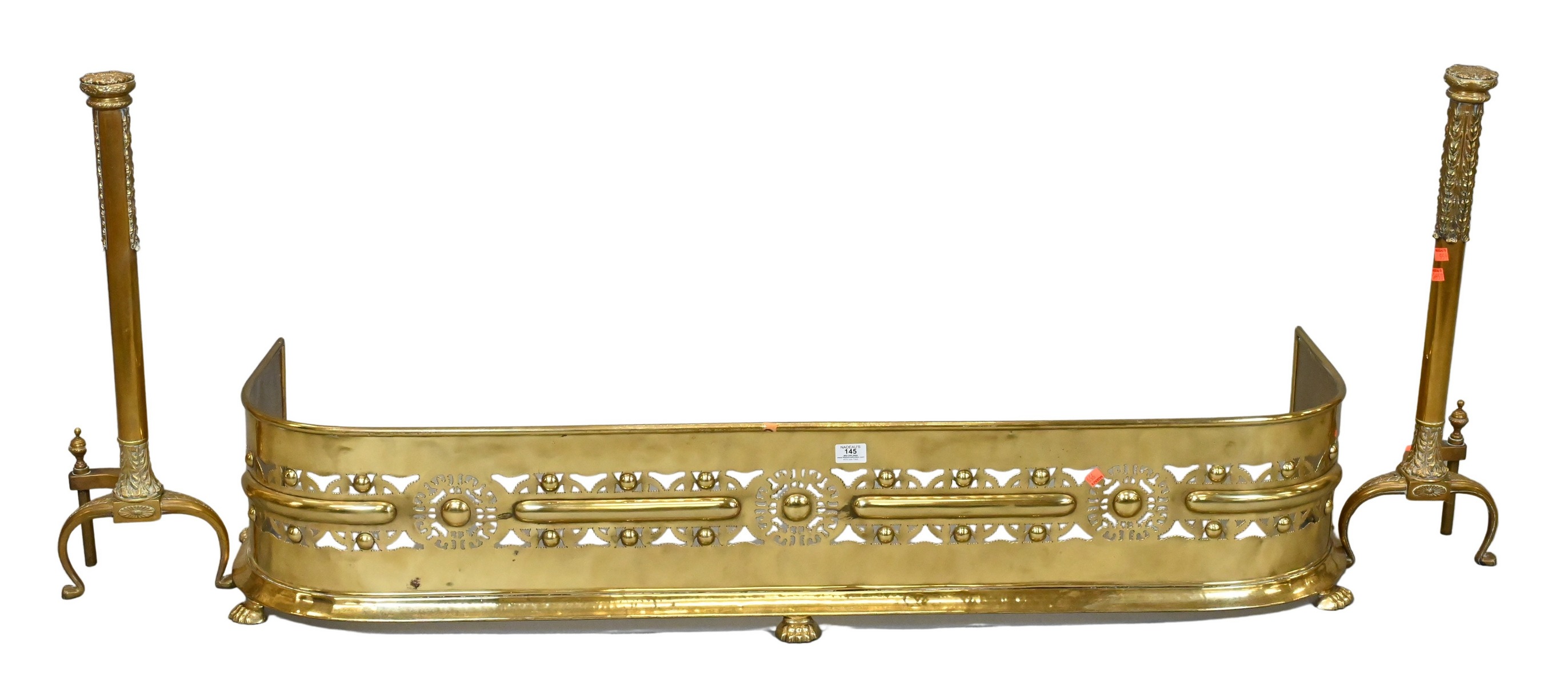 a pair of column form andirons, along with a Georgian style firefender having scrolling motif over paw feet