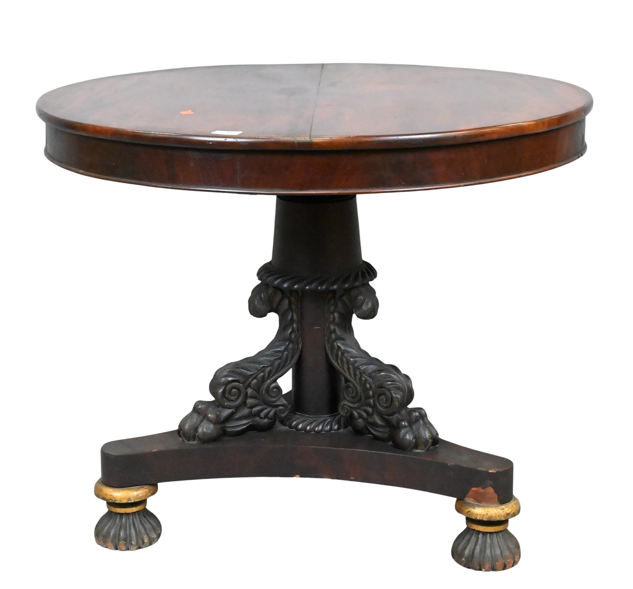 The circular top above a carved support and triangular base with concave sides, raised on lobed feet.