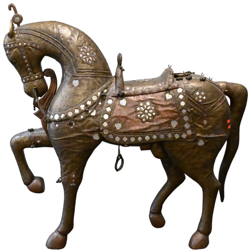 brass sheathing over carved wood with ornamental bells and inset glass depicting a bridled saddled horse posed with front foot lifted, stylized features