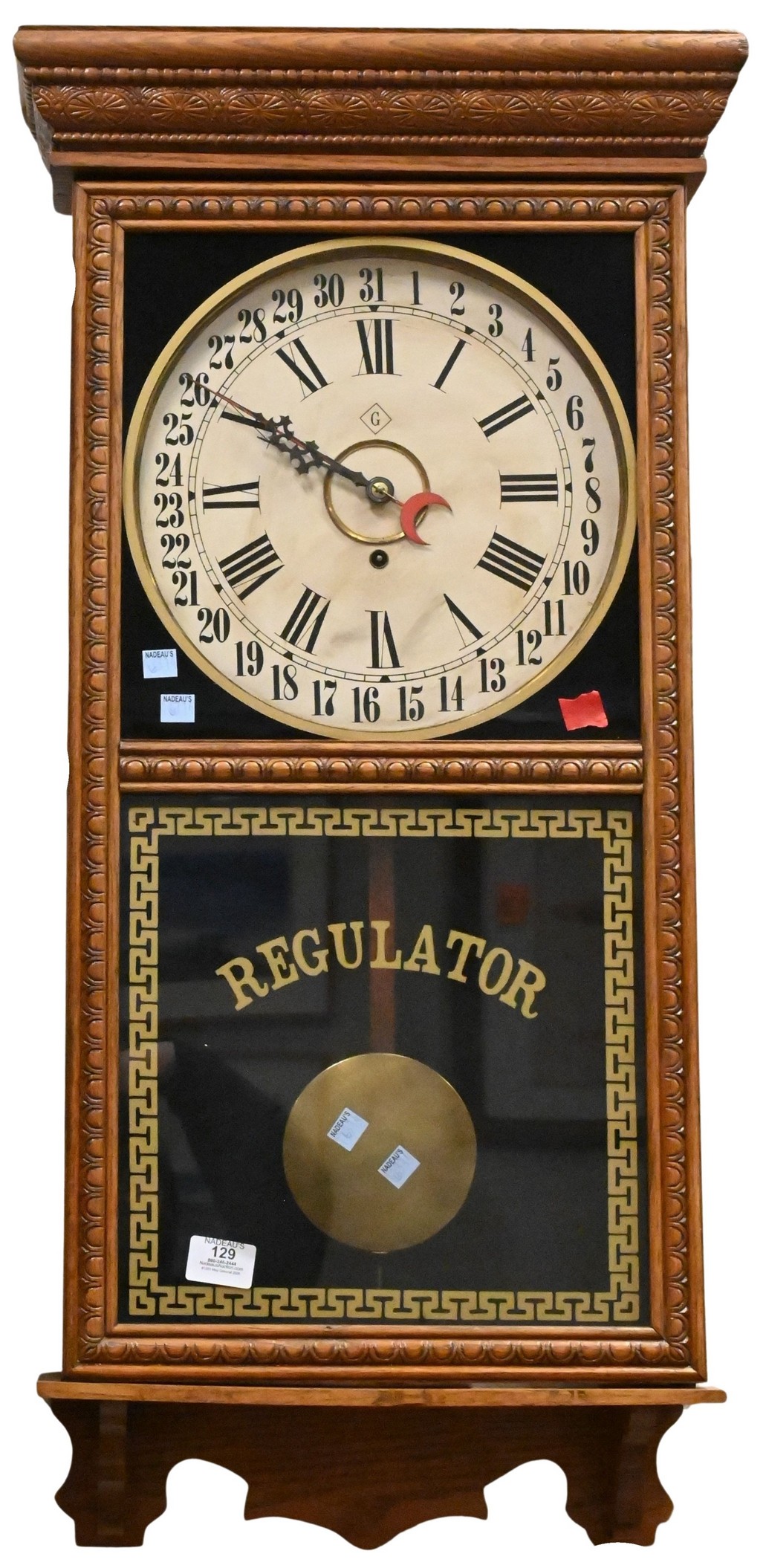 Oak Calendar Regulator Wall Clock, height 36 inches, along with inlaid continental regulator wall clock, height 36 inches