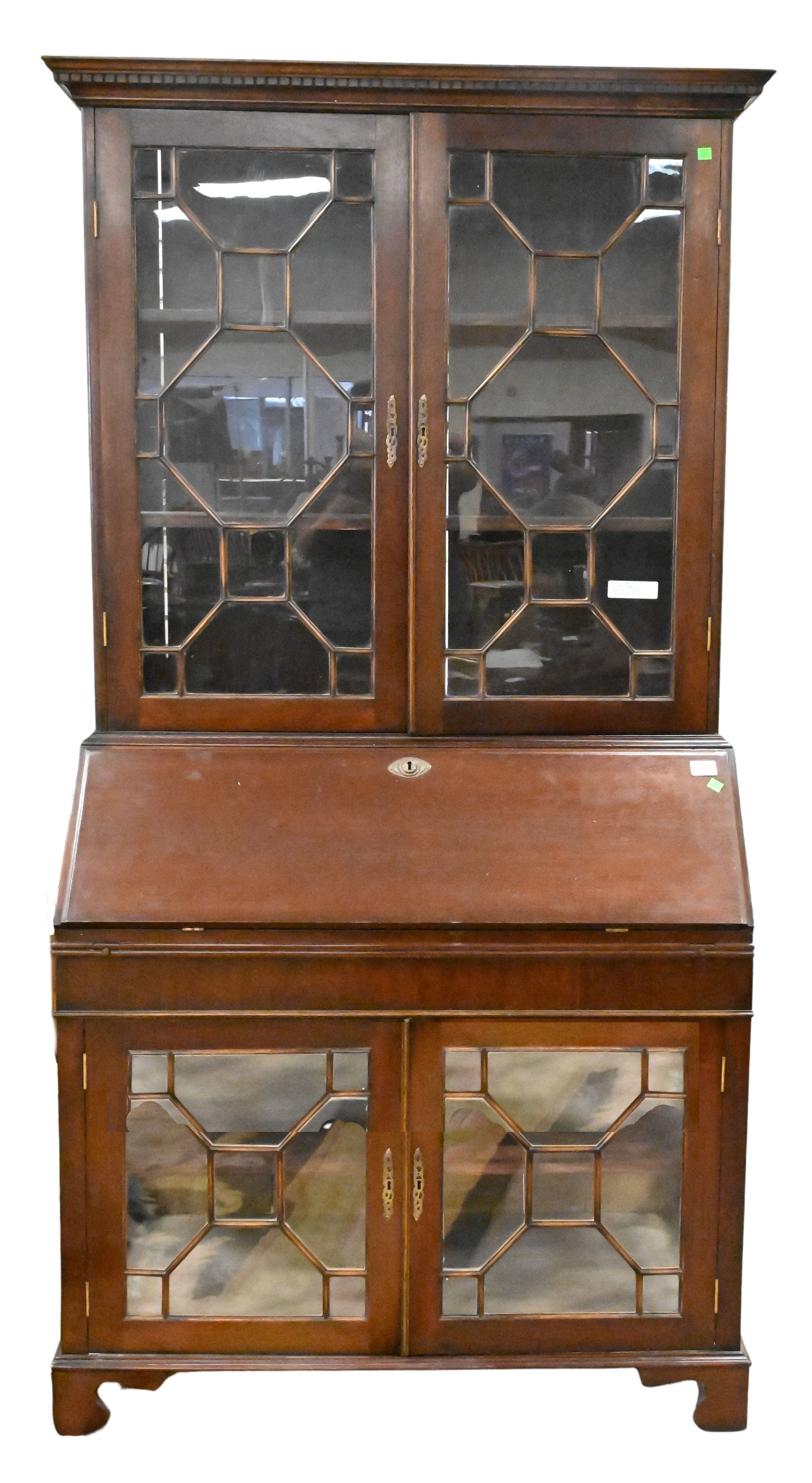 top having two glass doors and glass side paneling, set on a base having drop front over two glass doors and side paneling